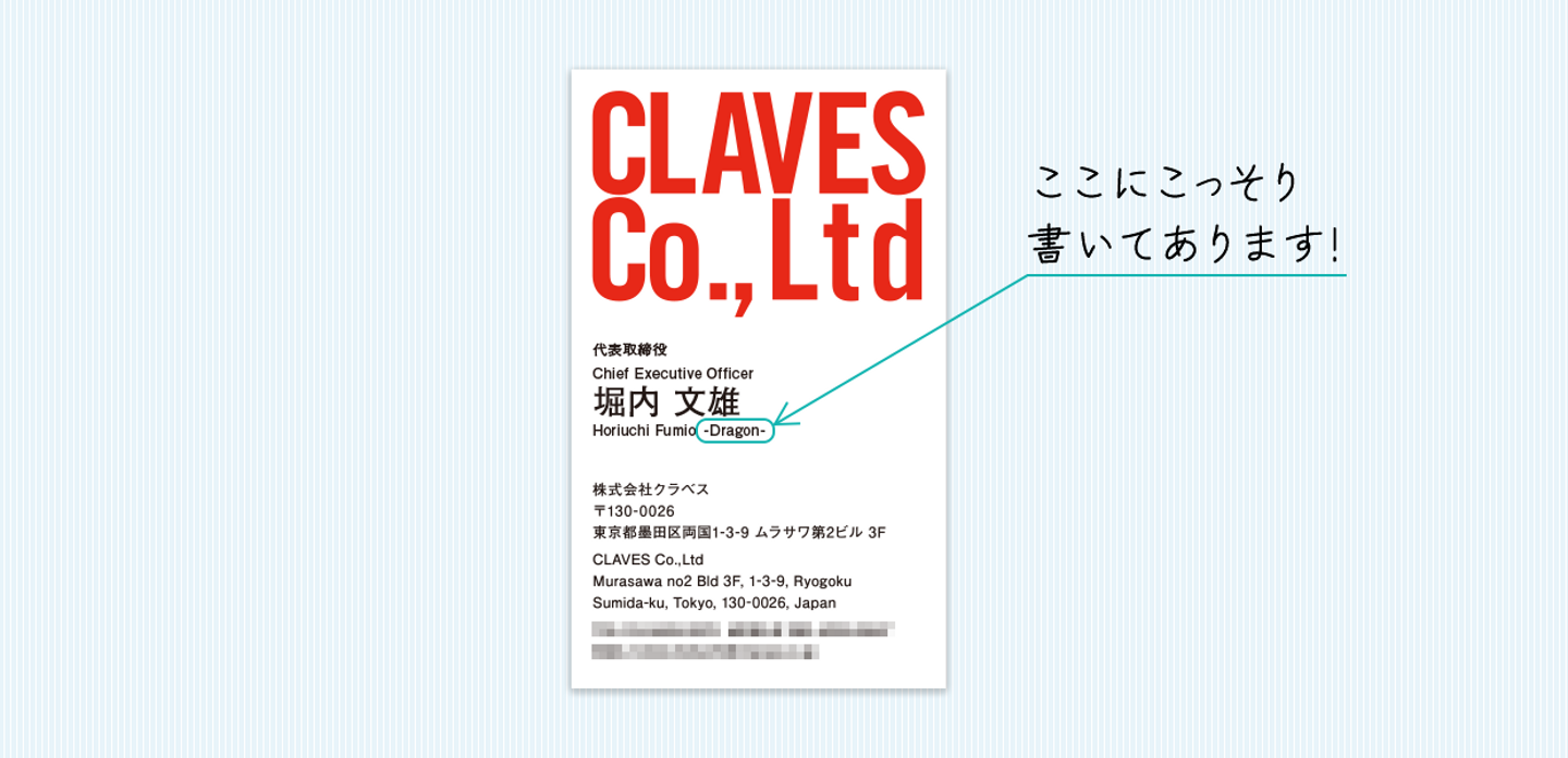 そこかしこで関わった方はご存知かと思いますが、クラベスでは、全員にコードネームが存在します。 私も含め全員です。創業して4名ぐらいになったときでしょうか。名刺にも入れています。