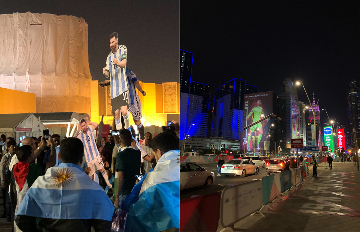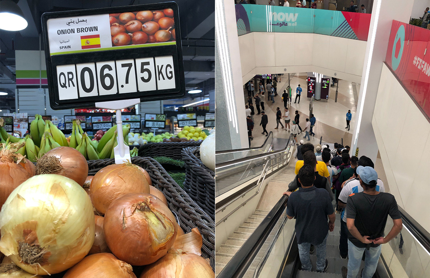 ↑左:野菜や果物は量り売りが多い。通貨はカタール・リヤル。右:深夜1時とは思えない人の多さ!