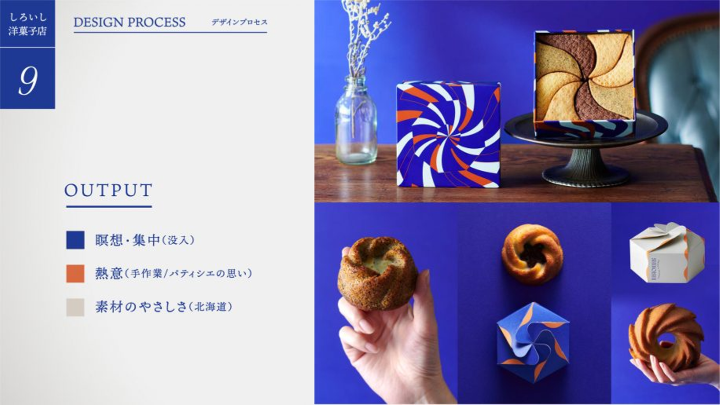 インディゴブルーには「没入」に通じる瞑想や集中、オレンジにはパティシエが愛情を持って手作りするパッション、グレーベージュには北海道素材の持つ優しさといった意味を込めて設定しています。