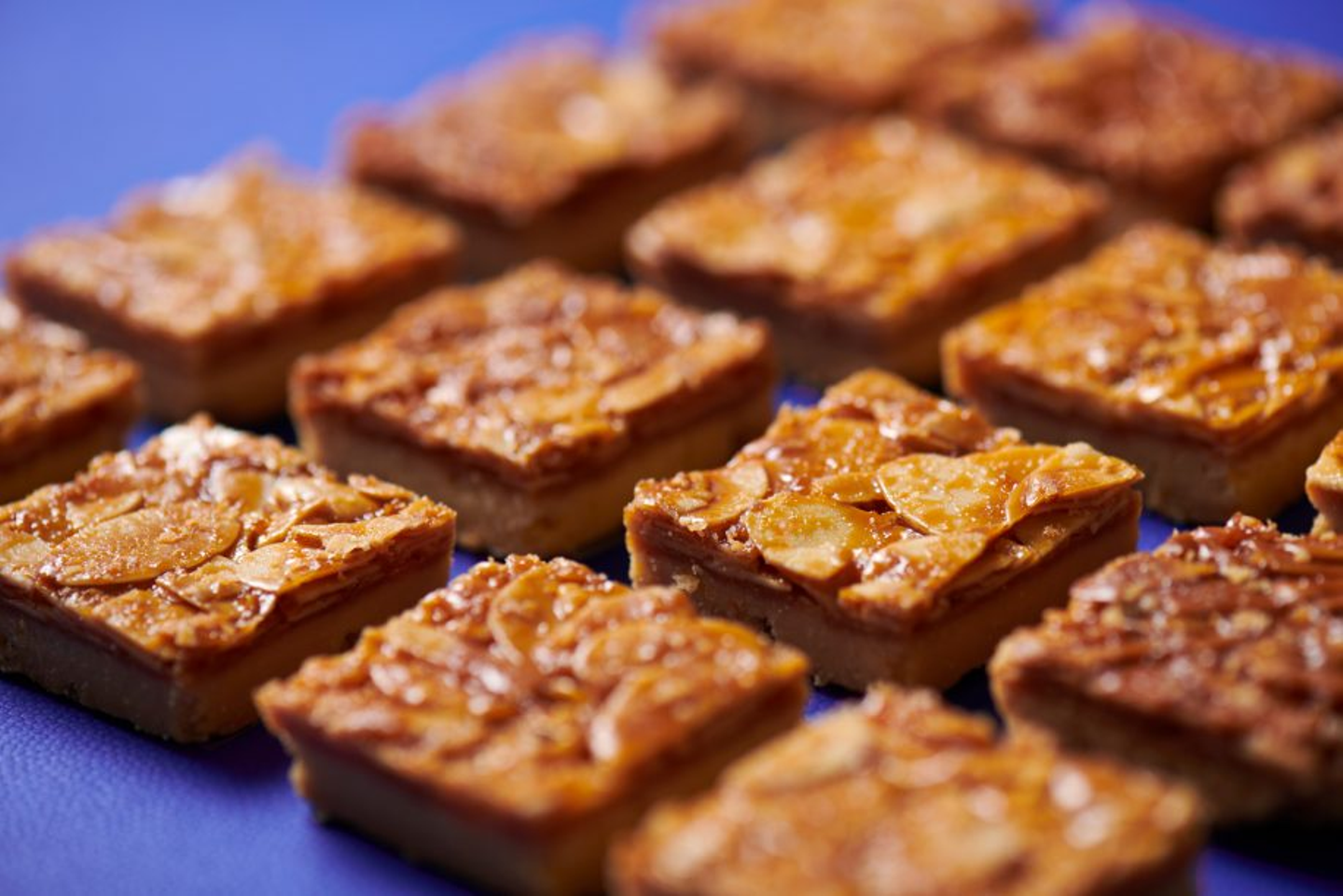 フロランタンは、工程に本当に手間がかかっていて、実は一つ一つを手でカットしています。クッキー缶の中で最も大変な作業で、工場のメンバーが毎日頑張って作っています。