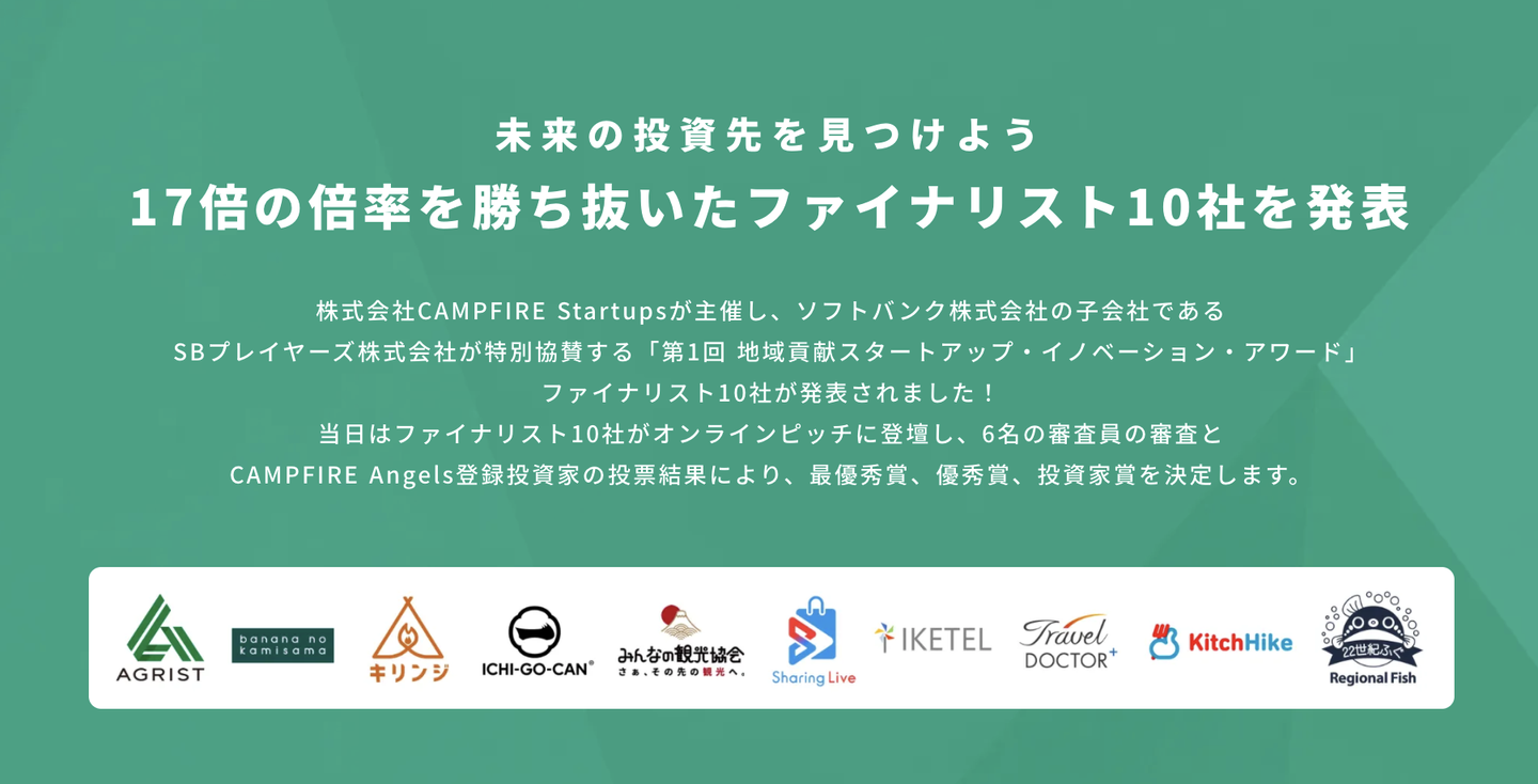 株式会社クリップスが運営する「SharingLive」がCAMPFIRE Startups主催「第1回 地域貢献スタートアップ・イノベーション・アワード」のファイナリスト10社に選出されました!