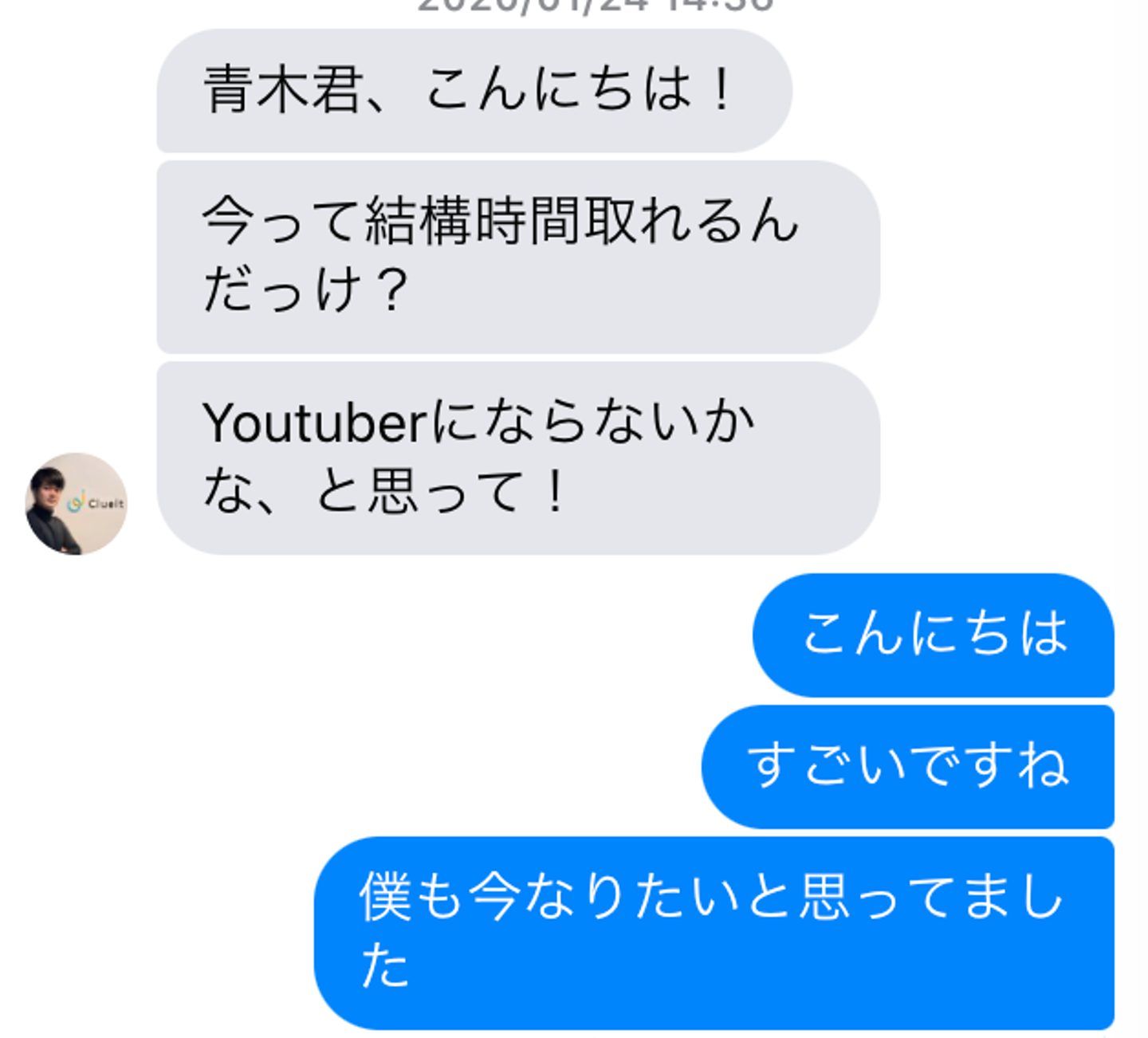クルイトの内定が決まって数ヶ月後に、急に代表の大濵から青木のもとに、「YouTuberにならない?」というメッセージが来ました。