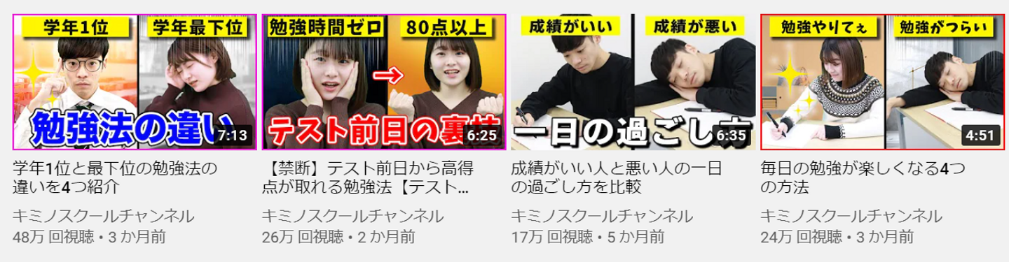 たくさん試行錯誤し、失敗する中で、少しだけ、効果が出る具体的な方法を見つけました。サムネイルの写真を左右で2つ分けて右と左で対比をする分割サムネと、演者二人でコント形式で勉強法を紹介する形式のものは大きく効果が出たということです。