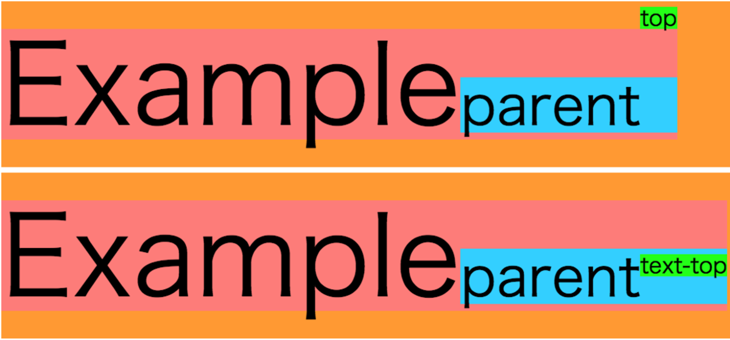 「text-top」は親要素の文字の上端(一番高い場所)を基準とします。なので上端を基準として配置することが可能です。