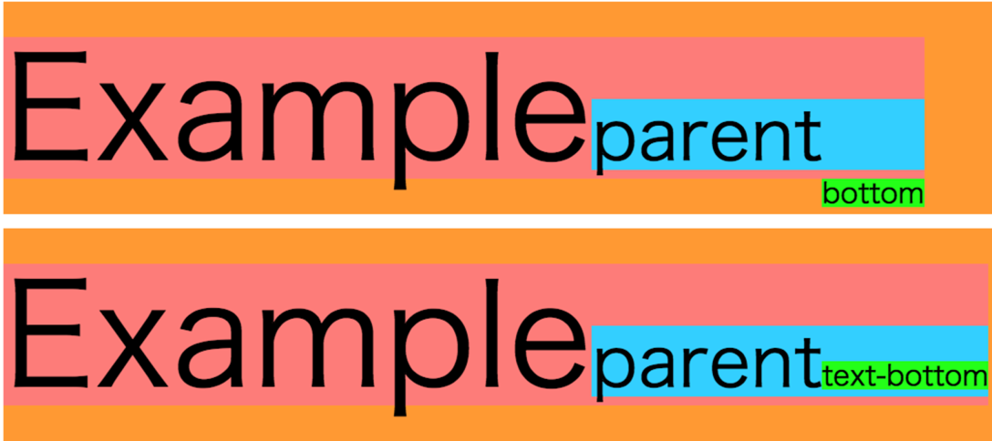 - text-bottom・・・適用した要素の上端を、親要素の文字の下端に合わせる (テーブルセルへの指定はできない)
