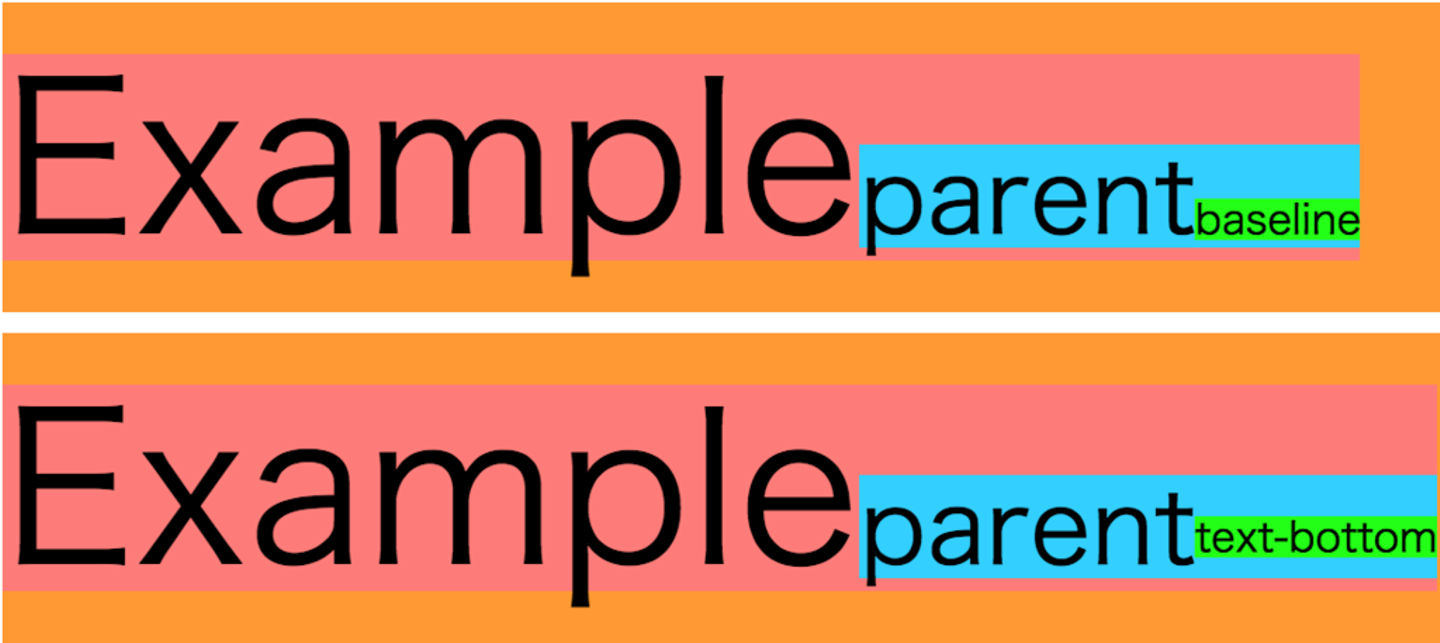 // 省略 以下はtopとtext-topと指定の仕方は同じです。上記を見てみるとどのような違いがあるのか迷うと思うのですが、親要素( .parent)を対して「line-height」を入れてみると違いが良く分かります。