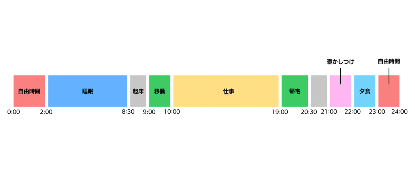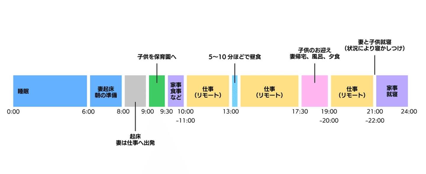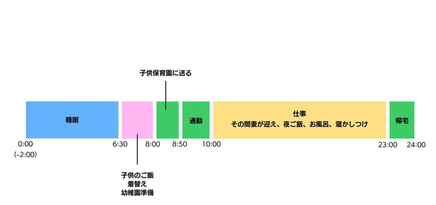 10:00-23:00 仕事 その間妻が迎え、夜ご飯、お風呂、寝かしつけ