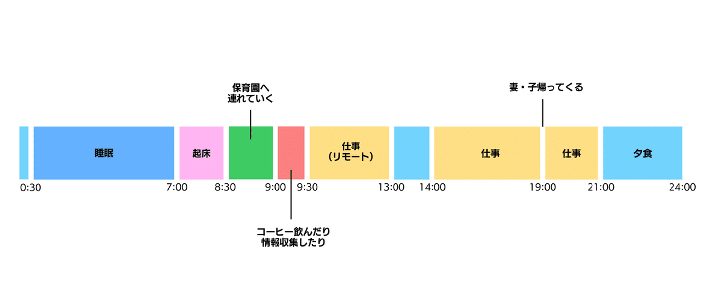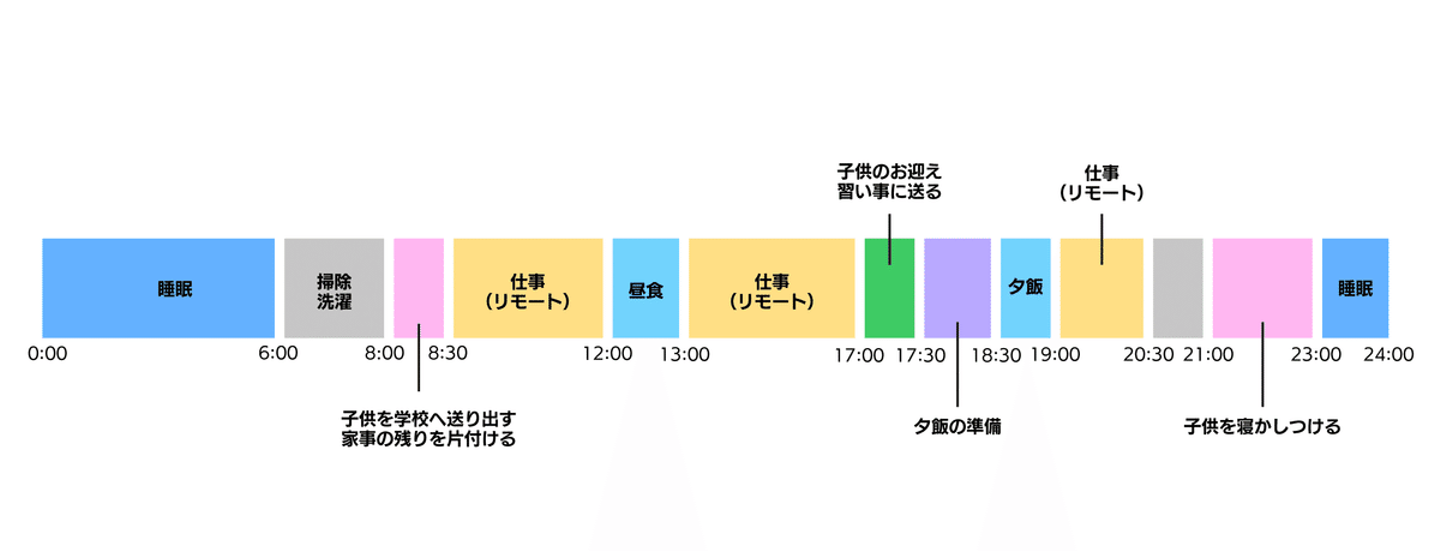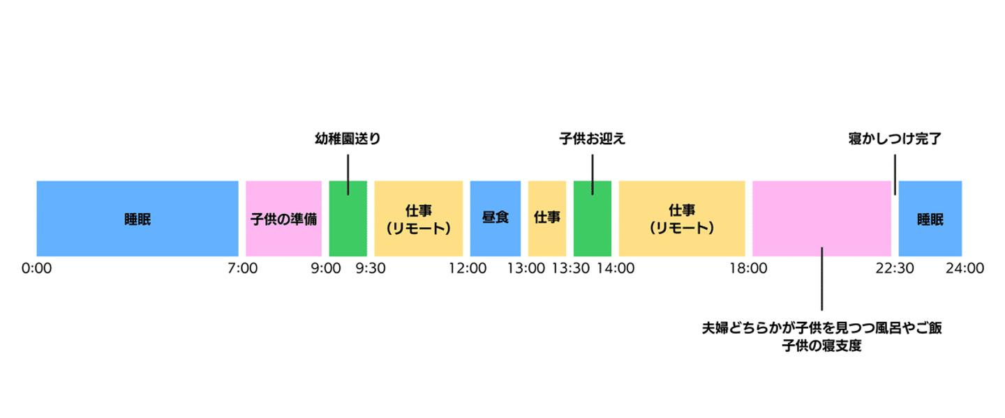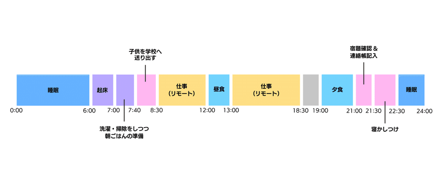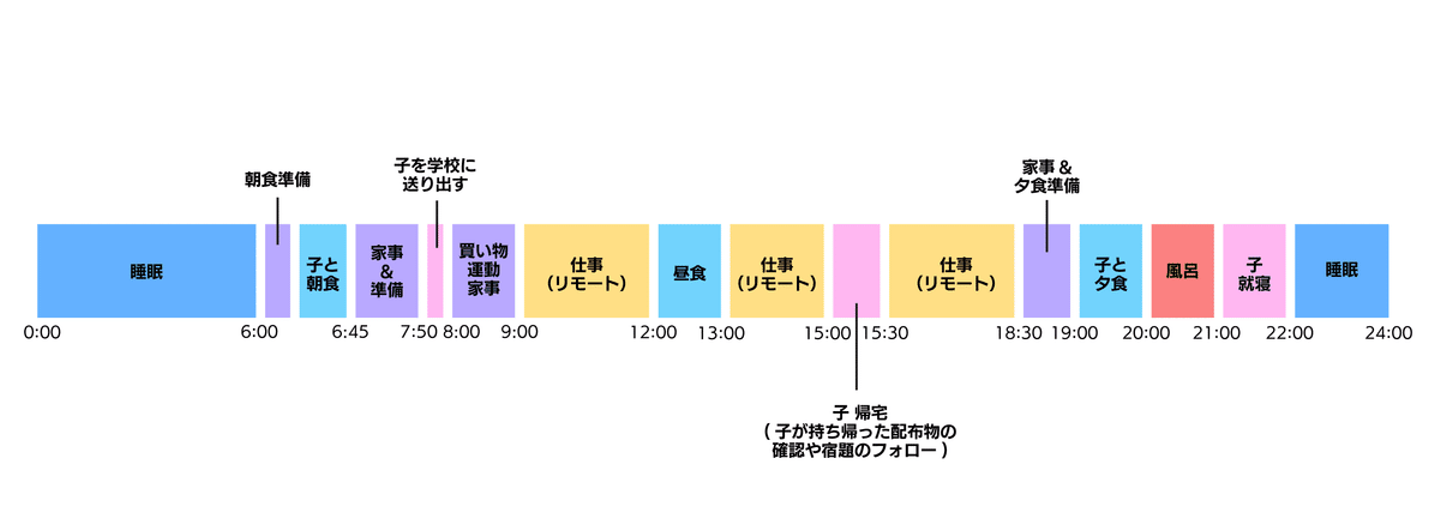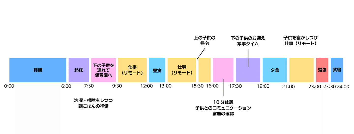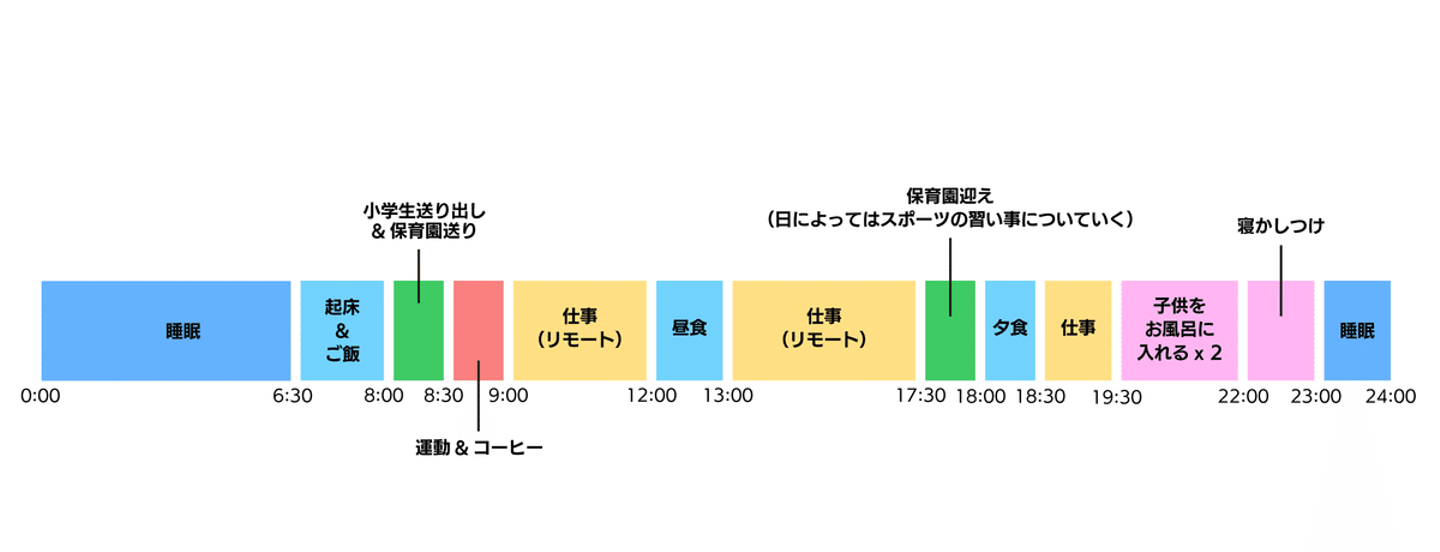 リモートワークの合間にお迎えや夕食を取る感じです。子どもたちの気持ちに合わせるため、ほぼすべての予定が固定時間ではなく前後30分くらいの余裕を持たせているつもりでやっています。