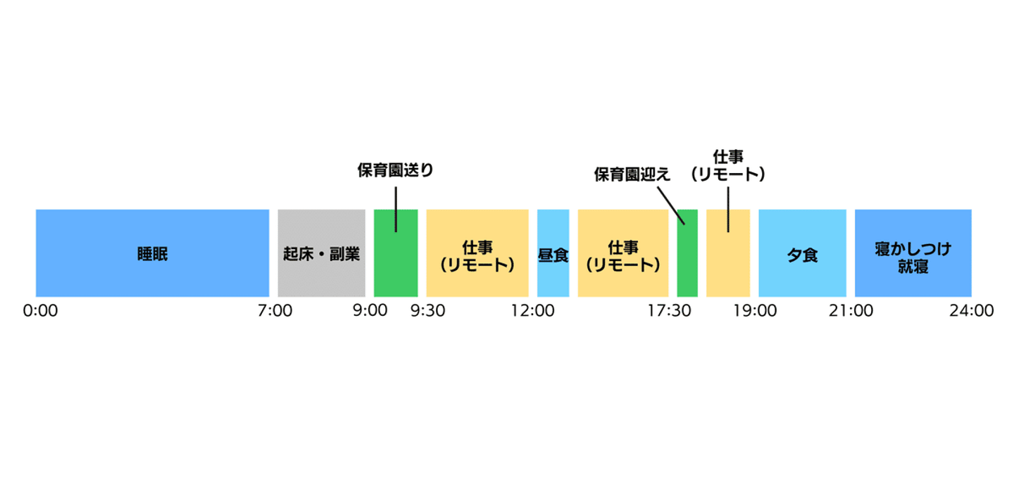 朝は保育園へ送って家に戻ってきた流れでそのまま仕事モード。子供が帰ってきたときは、子供の気分によって流動的に時間配分を変えている。(元気に帰ってきたときはそのままちょっと遊んだり…など)。