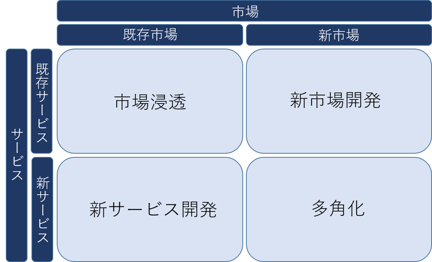 アンゾフの成長マトリクスでいう、新規市場開発戦略、新サービス開発戦略、多角化戦略の部分ですね。これらをまとめて新規事業と呼んでいます。