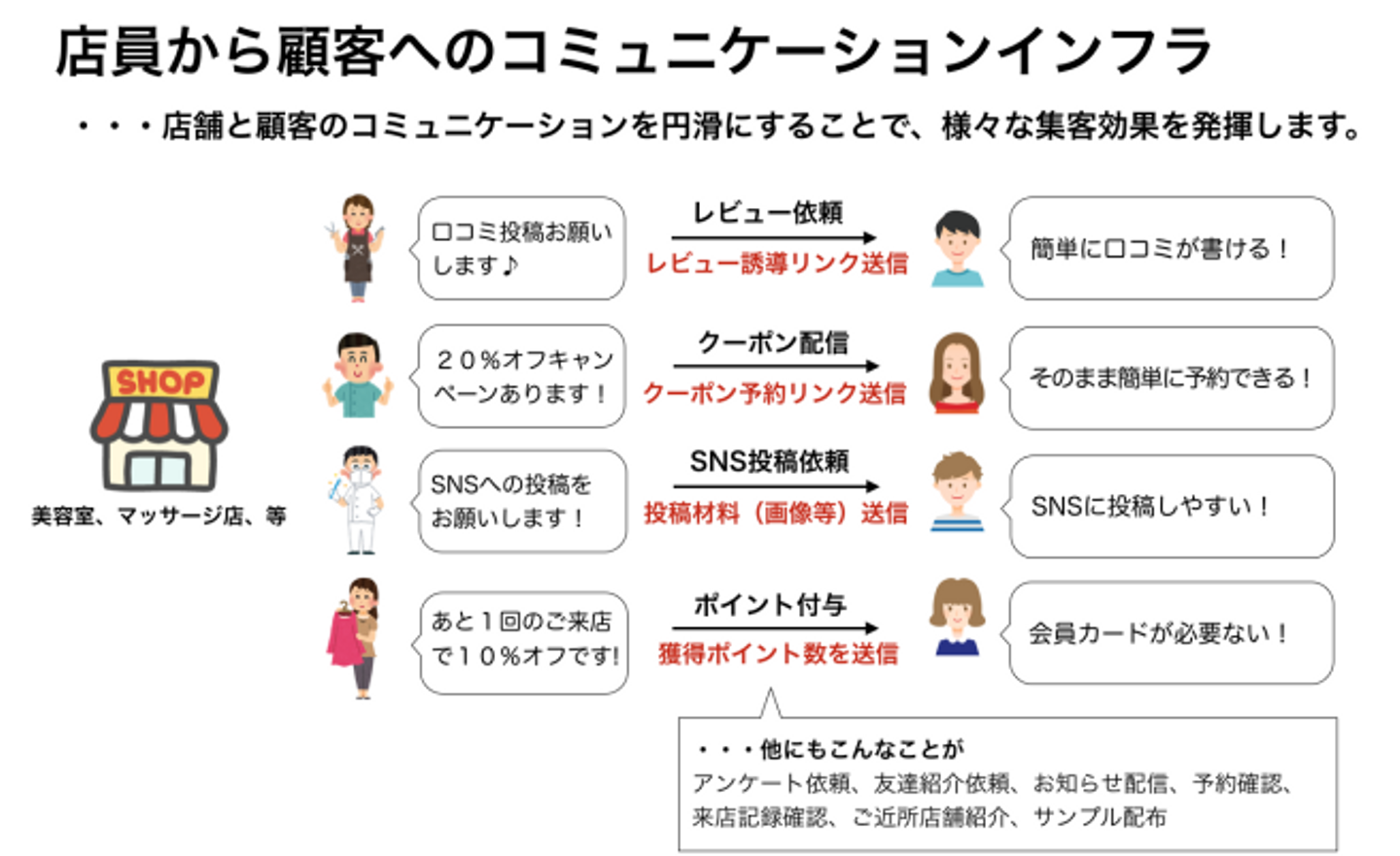 店舗と顧客のコミュニケーションインフラを提供することは、様々な面において質の高いサービスを提供する店舗の集客を支援することができるのです。