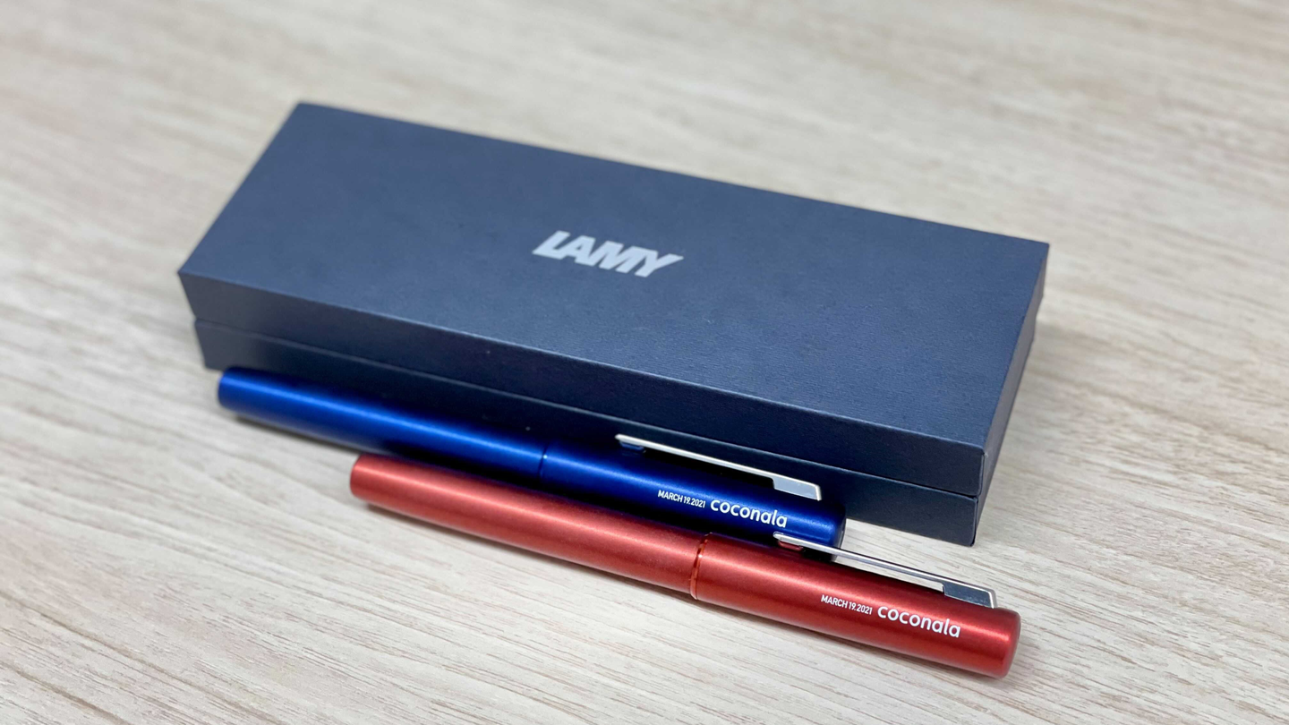 “長く身近に使えるもの”ということで決めました。デザイン性にもこだわり、ブランドはLAMYを選択!メモリアルな日を共に迎えた社員みんなが大切に使ってます。