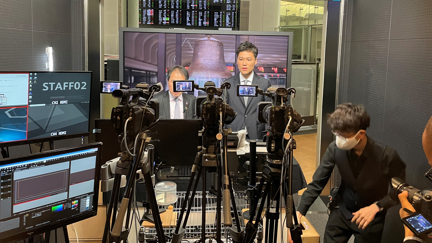 一方、東証では代表取締役社長CEOの鈴木がStock Voiceという上場した当日に配信される番組に生出演するという大役が!私もPR担当として、一緒に現場に入り資料や進行、鈴木のコメントを確認しました。