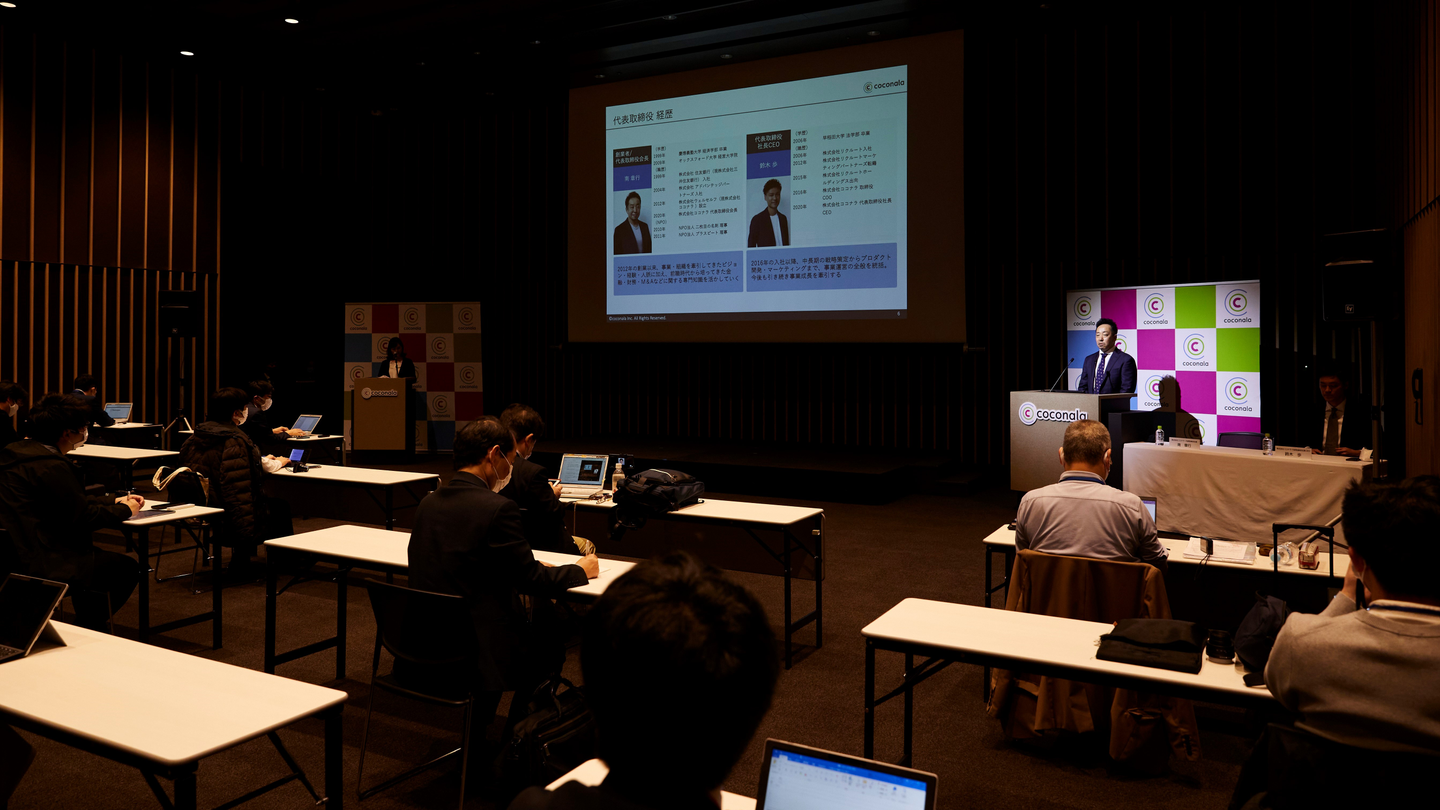 多くの会社は東証の中の「兜記者クラブ」所属の会場で行うことが慣習ですが、ココナラの場合は東証に近い外部の会場である日本橋ホールをお借りしました。