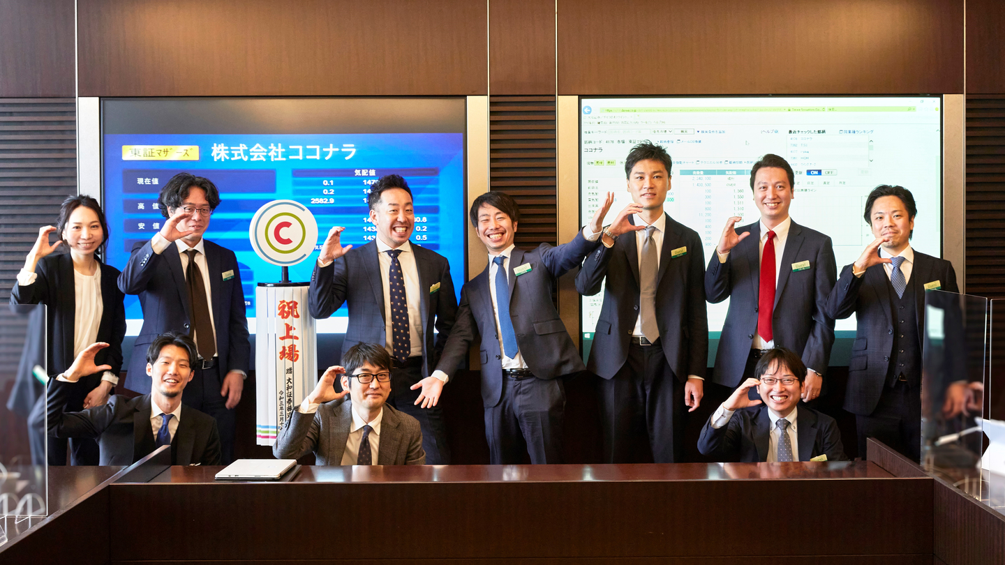 IPOの主幹事である大和証券様でお祝いをいただき、みんなで初値を確認をします!スクリーンに祝上場の文字と初値が表示された時は改めて喜びをわかち合いました!
