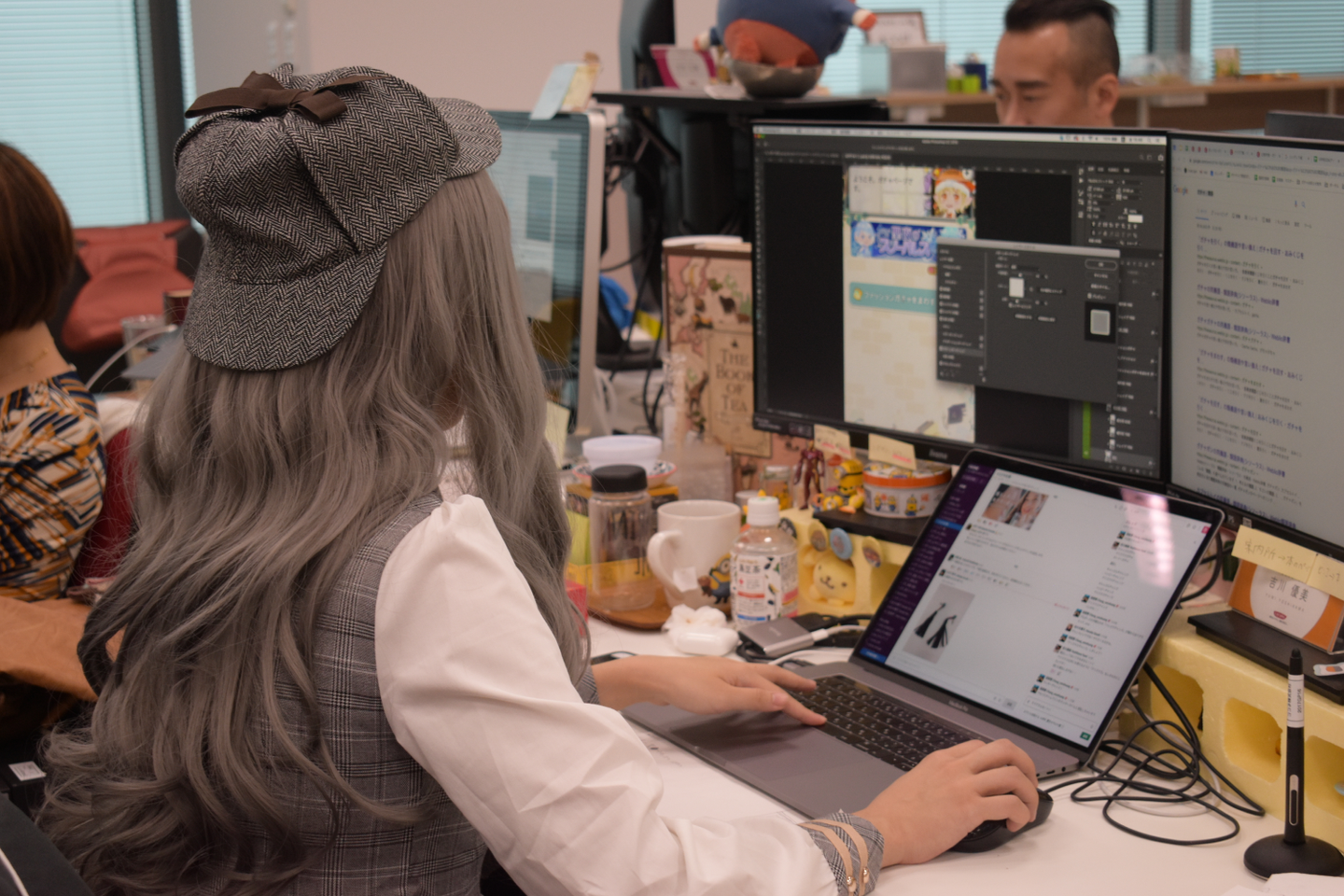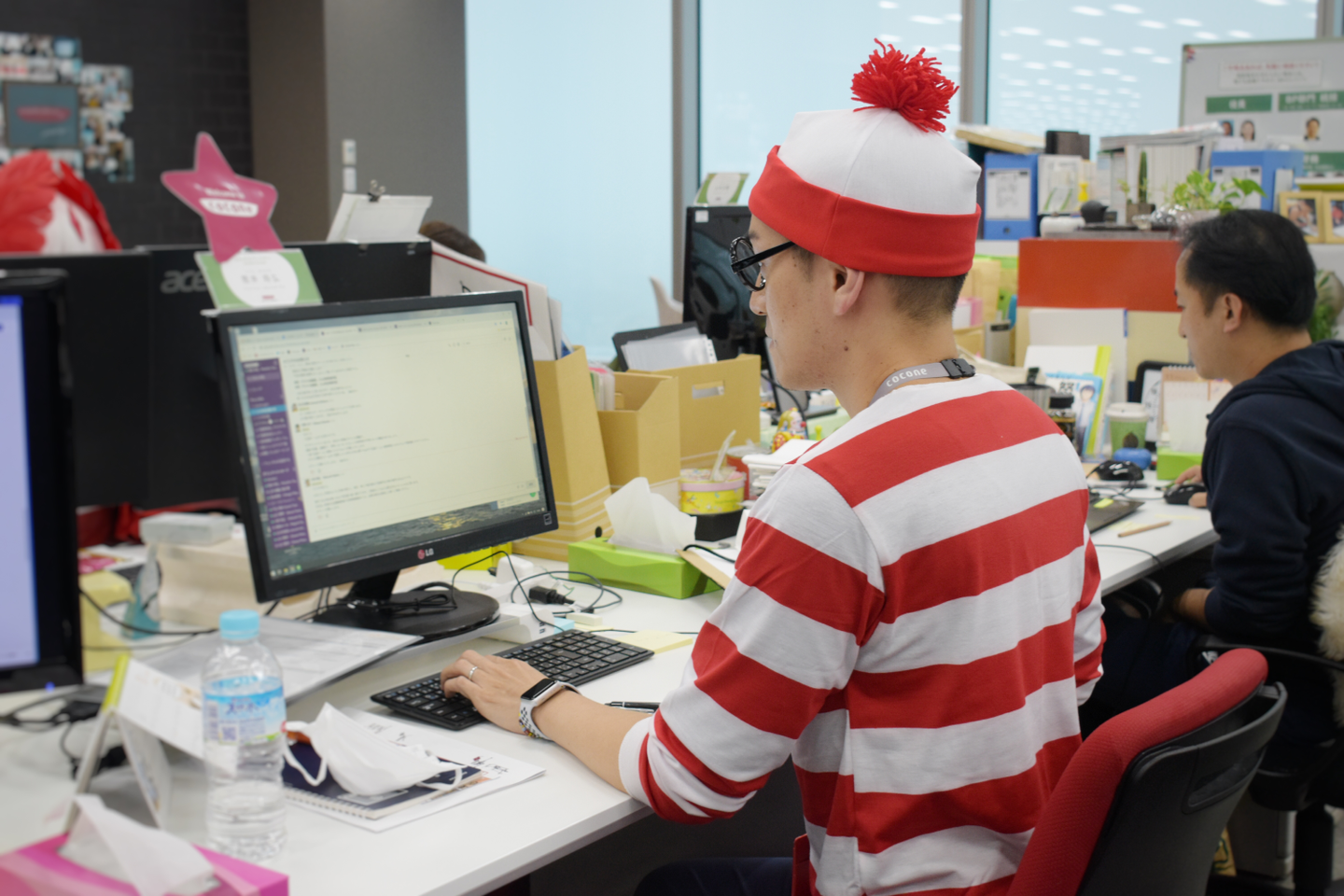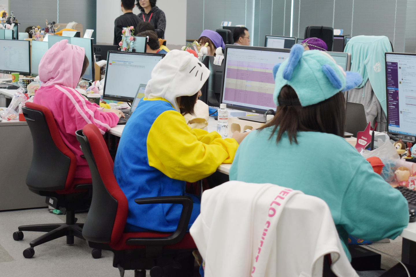 すでに着替えを済ませた人がデスクで仕事をしている姿は、なんだか変な感じしますね笑。