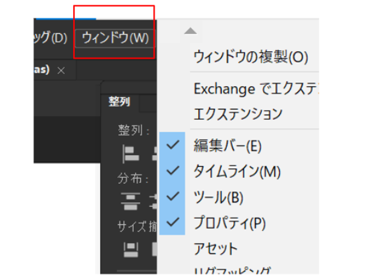 また、該当のウインドウが画面上にない場合は①メニューバー内にある「ウインドウ」をクリックするとウインドウの一覧が出るので、ほしいものをクリックします。(下図)