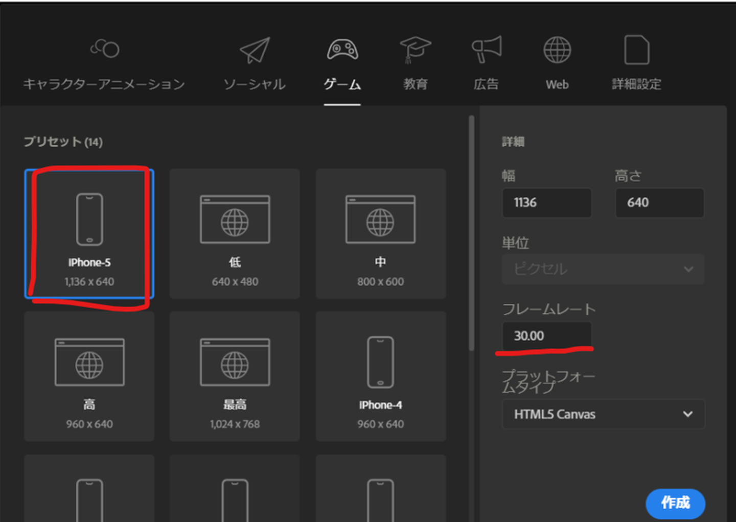 今回はゲーム制作などでもよくつかわれるスマホに合わせたサイズ「iPhone5 1136×640」を選択します。