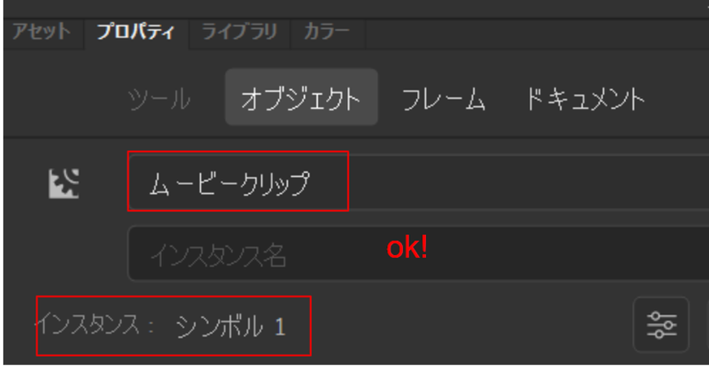右側の「プロパティ」内「オブジェクト」に「ムービークリップ」、