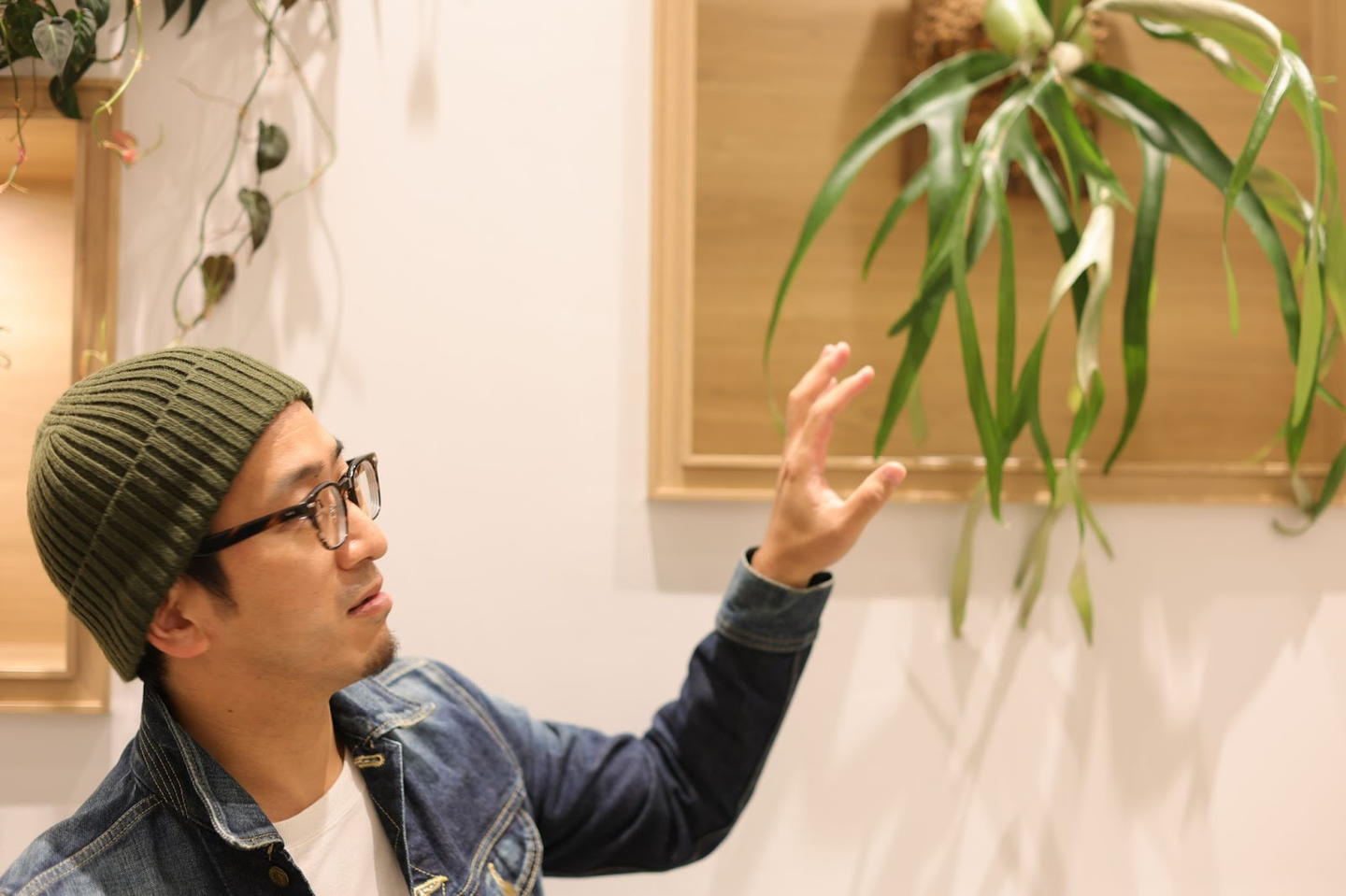 (ビカクシダ(右上)と松本さん。元々熱帯雨林の木の幹にくっついて生える植物だということで、壁に垂直に植えているんだそう。)
