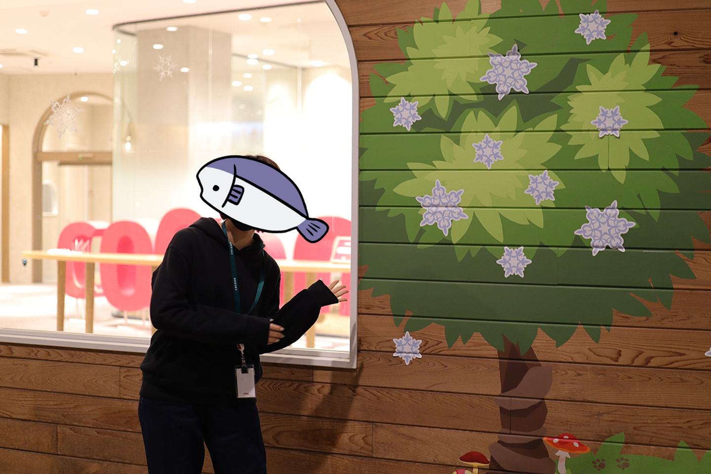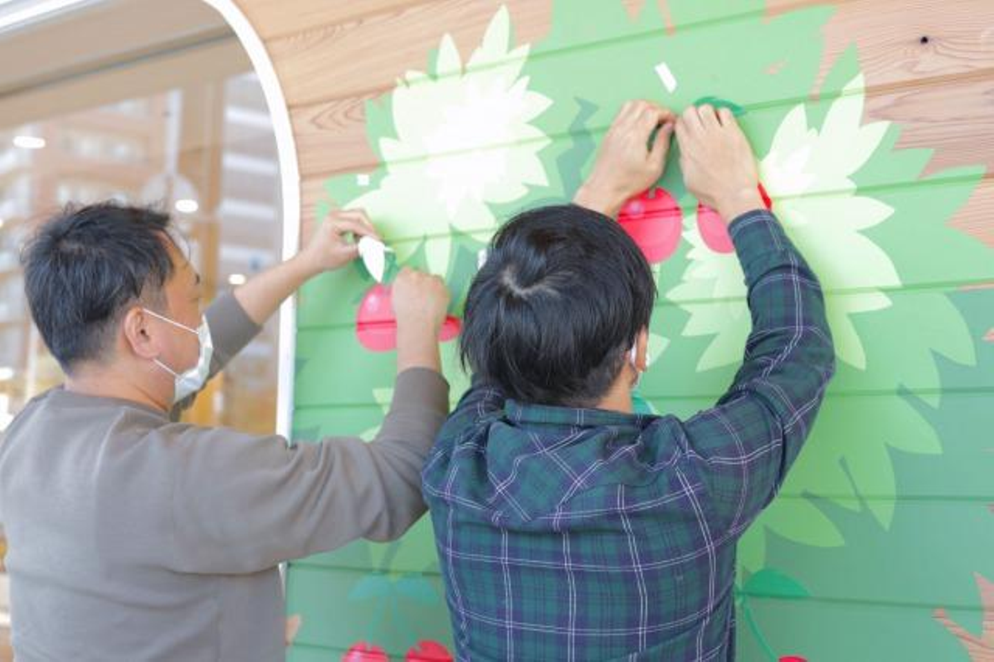 エントランスのところにはバスを待たれる方のためにベンチを設置したり、木のイラストを描いたり、近隣の皆様へのお知らせを張っています。木はフォトスポットとして作ったもので、リンゴやサクランボなど、フルーツを季節ごとに変えて楽しんでいただけるようにしています。