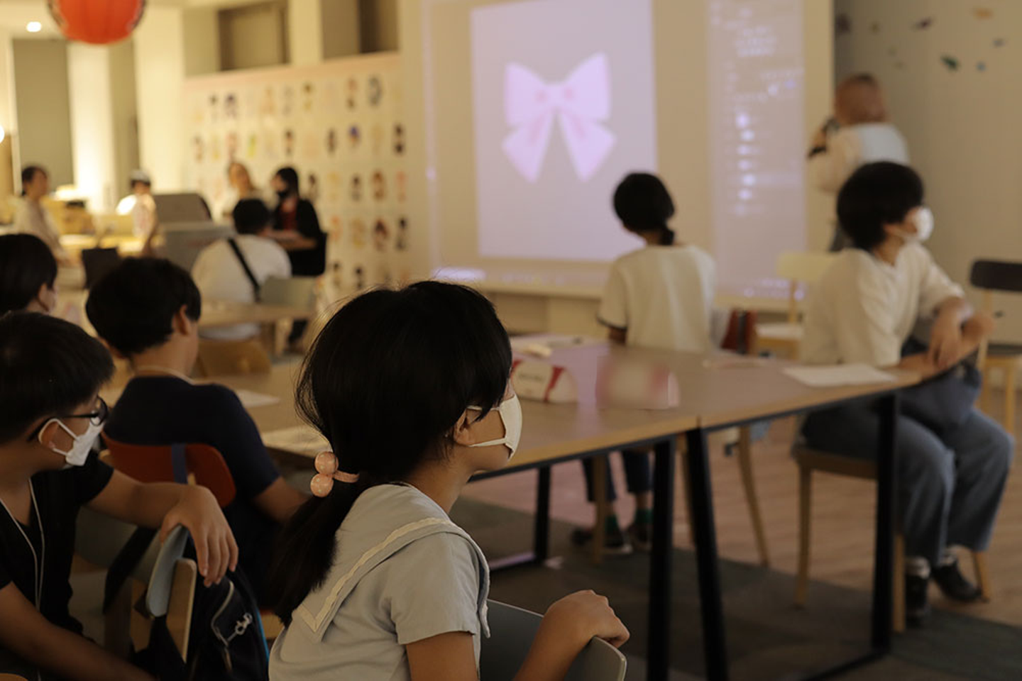 影をつけて立体感を出したり、オーガンジーのような透け感を出すなど、全く違う印象を受けるリボンを次々に描いていくデザイナーに子どもたちもじっと注目をしていました。