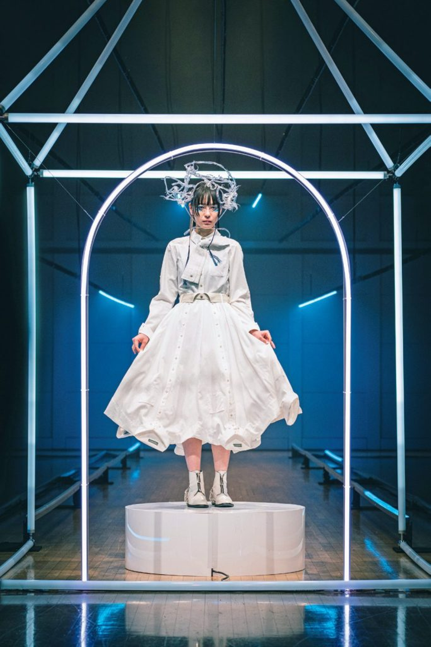 写真は、ハザマ 2023 ランウェイコレクション「UNKNOWN UNKNOWN(未知の未知)」より。ブランド史上2度目となるショー形式の発表を行ったシーズン。下は、高松さんが好きだという一着「見えないものを見ようとして見上げた夜空に駆ける透明彩度のワンピース」。