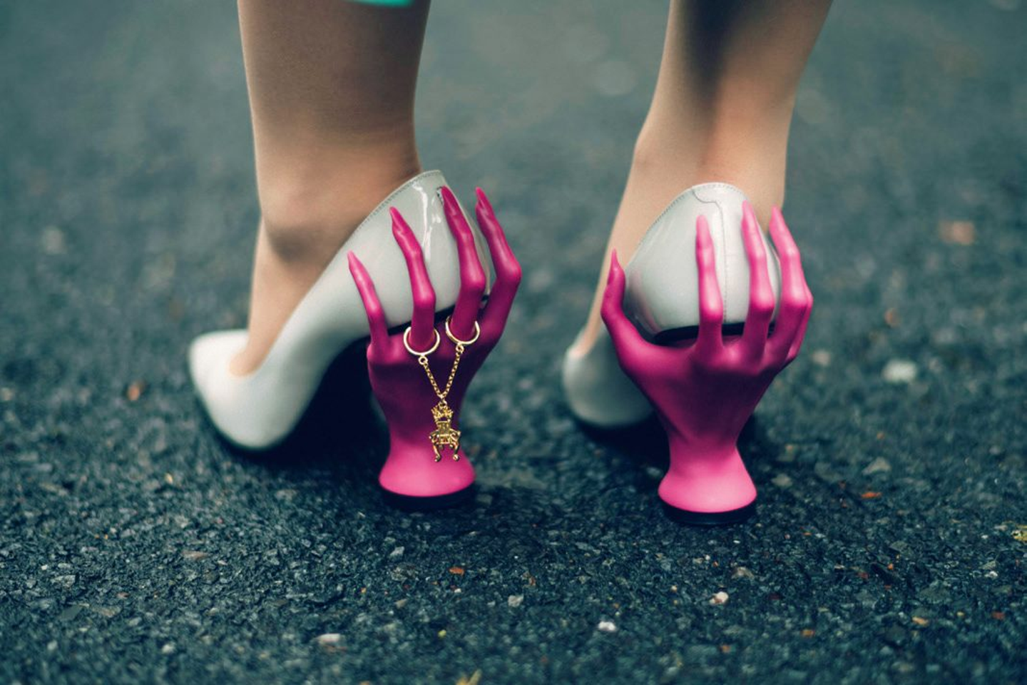 ハザマを代表する人気アイテムが、デザインヒールのシューズ。上 長沢さんが衝撃を受けたという「惹き鉄となるヒールパンプス」、下 「惹きずり込まれる運命のヒールパンプス」。これらの靴はカプセルトイとしてミニチュアが販売され、それも大きな話題に。