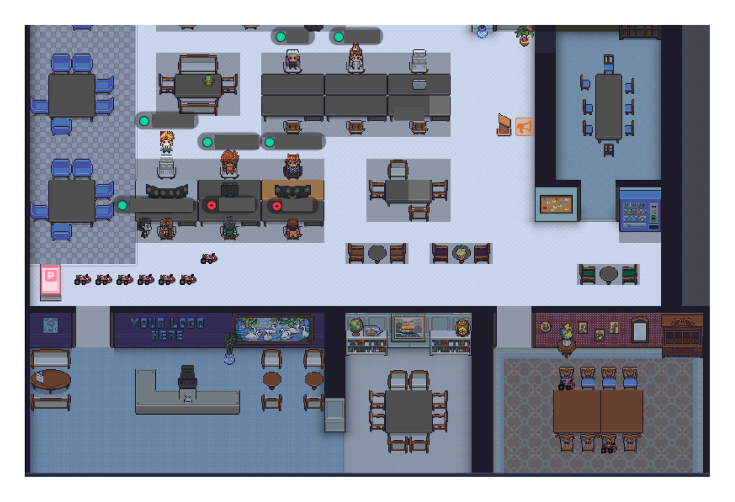 Gatherとは、レトロゲーム風の遊び心のあるUIが特徴のオンラインコミュニケーションツールです。 自分のアバターを操作して部屋を自在に行き来することができ,出勤やオフィスでの勤務を仮想的に体験することができます。