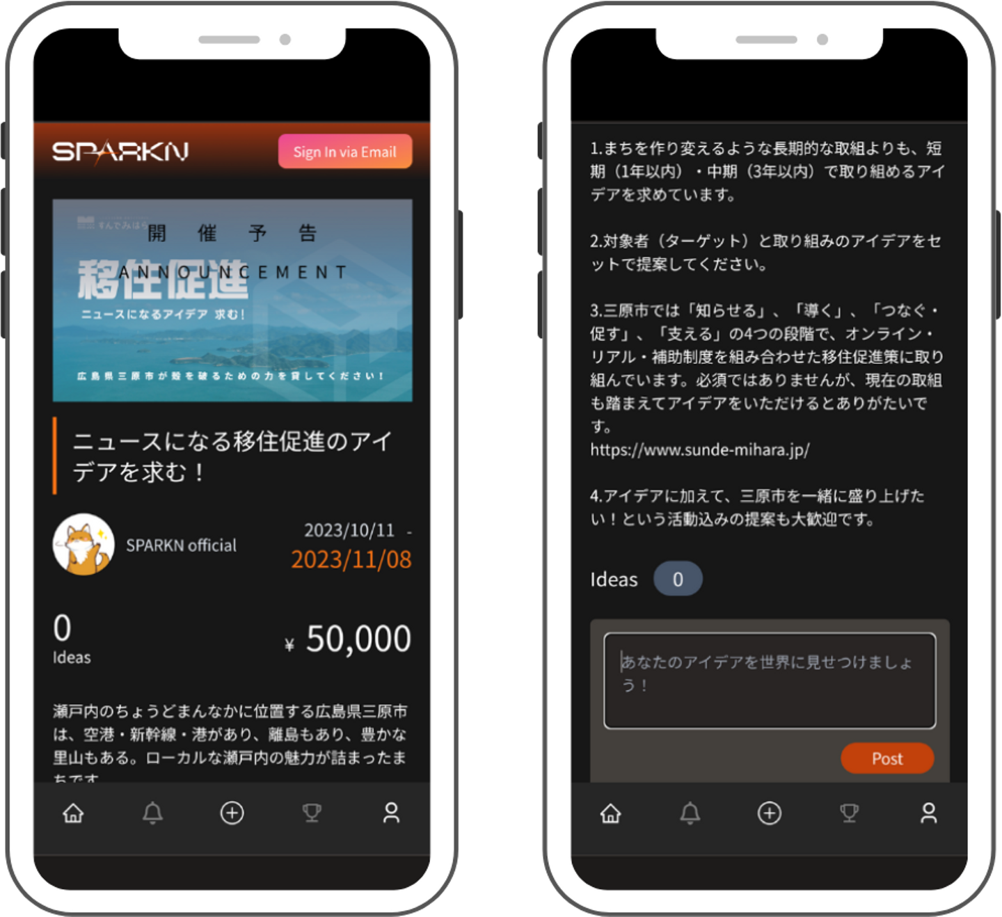 SPARKNのリリースを記念し、SPARKNのコンセプトに共感いただける広島県の自治体や企業を中心としたコンテストの開催を予定しています。