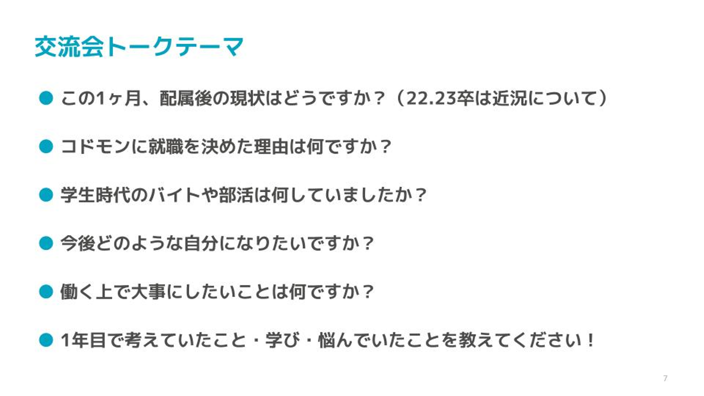 コドモンに新卒入社した頃の初心を思い出す質問から、これから目指していきたい未来のことまで、幅広く話ができるように、いくつかのトークテーマを取り入れています!