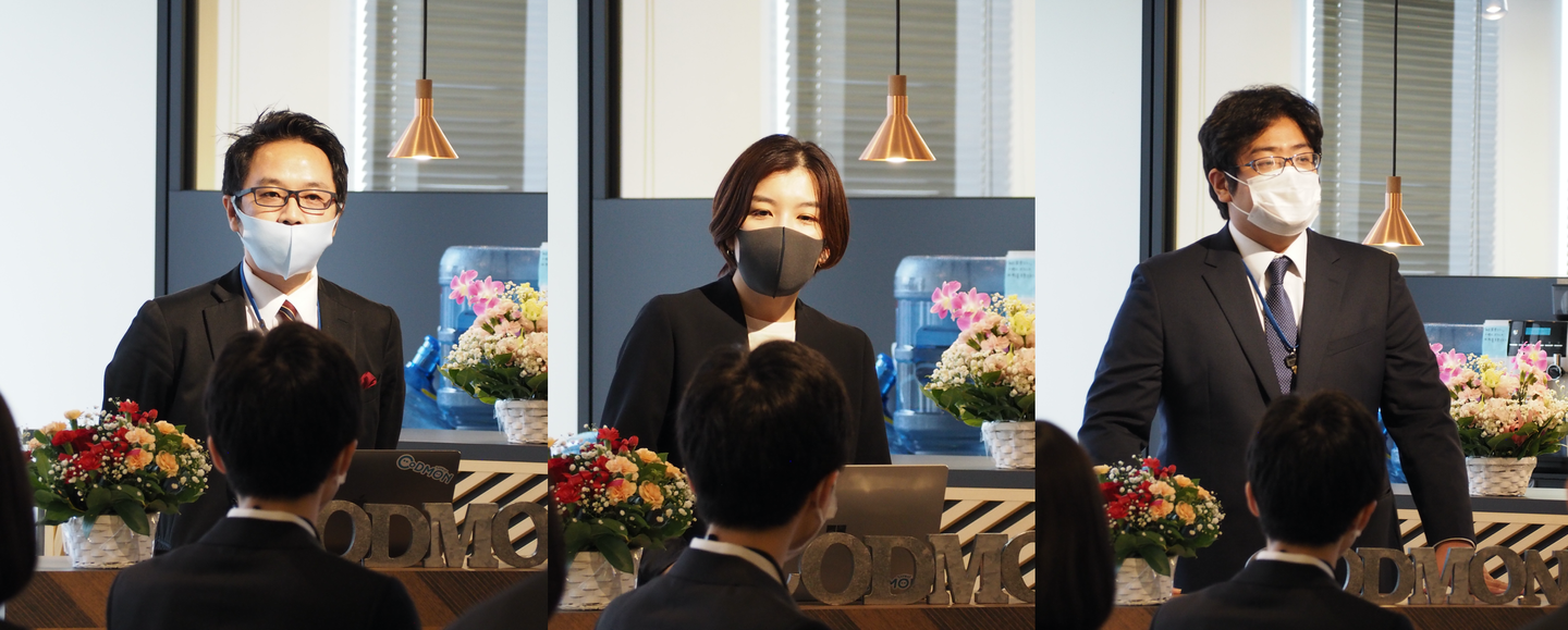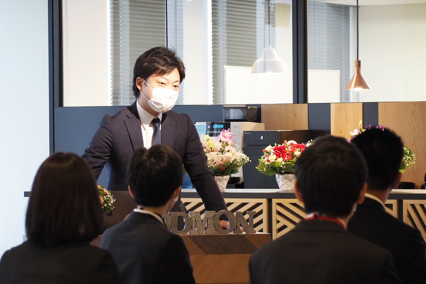続いて代表 小池からの挨拶。「運を掴むための秘訣は、当たるまでくじを引き続けること」という言葉に、真剣に聞き入っている内定者たちが印象的でした。