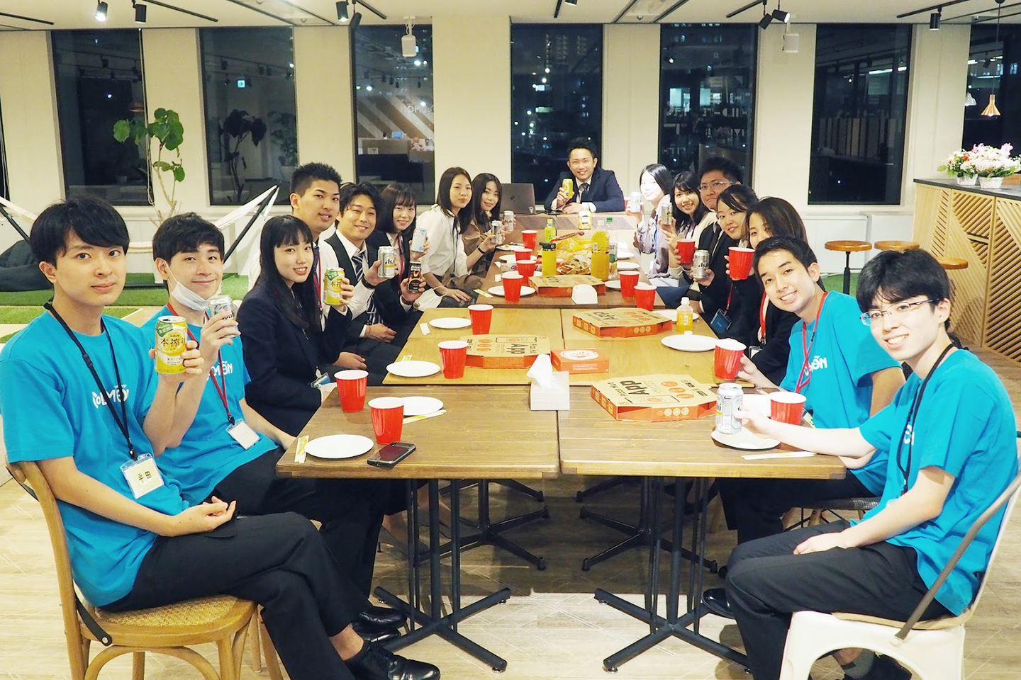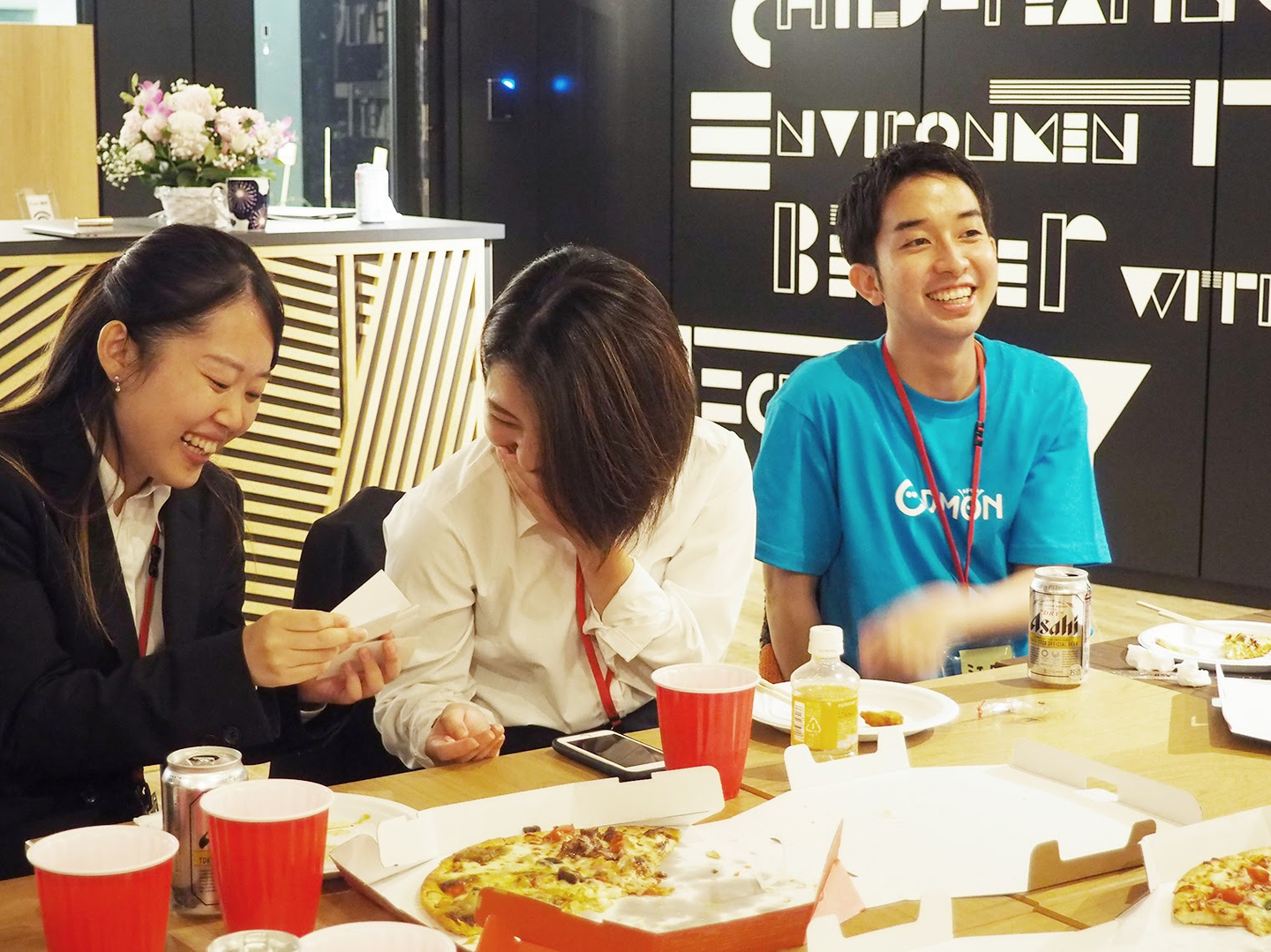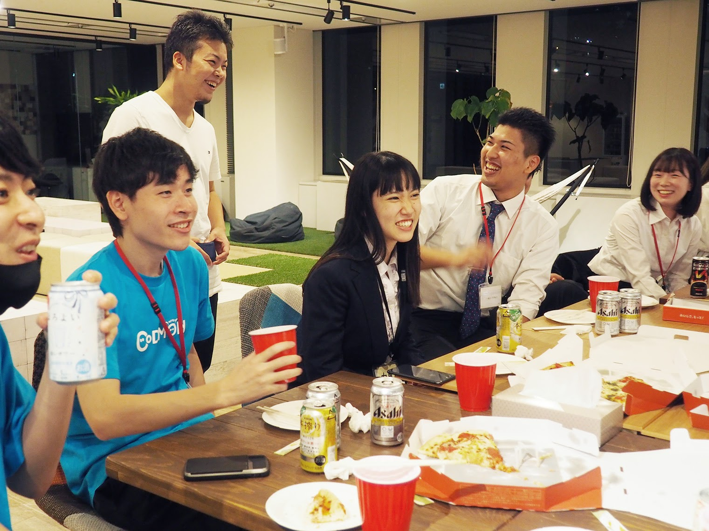本気で取り組んでへとへとになった内定者たちを待っていたのは……20新卒の先輩と、美味しそうなピザ!!