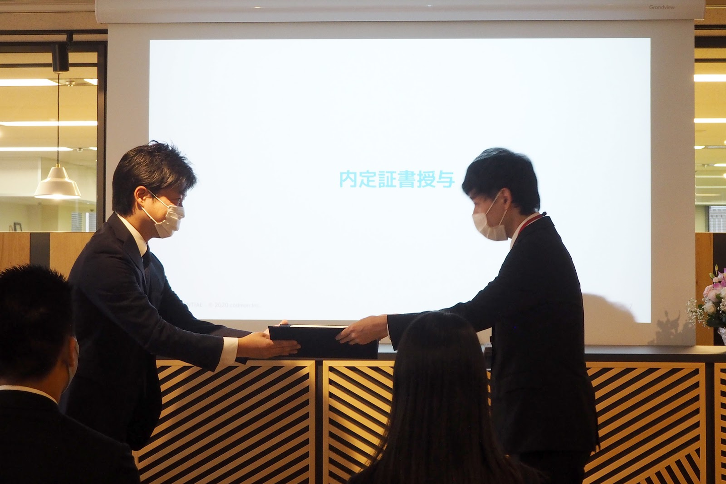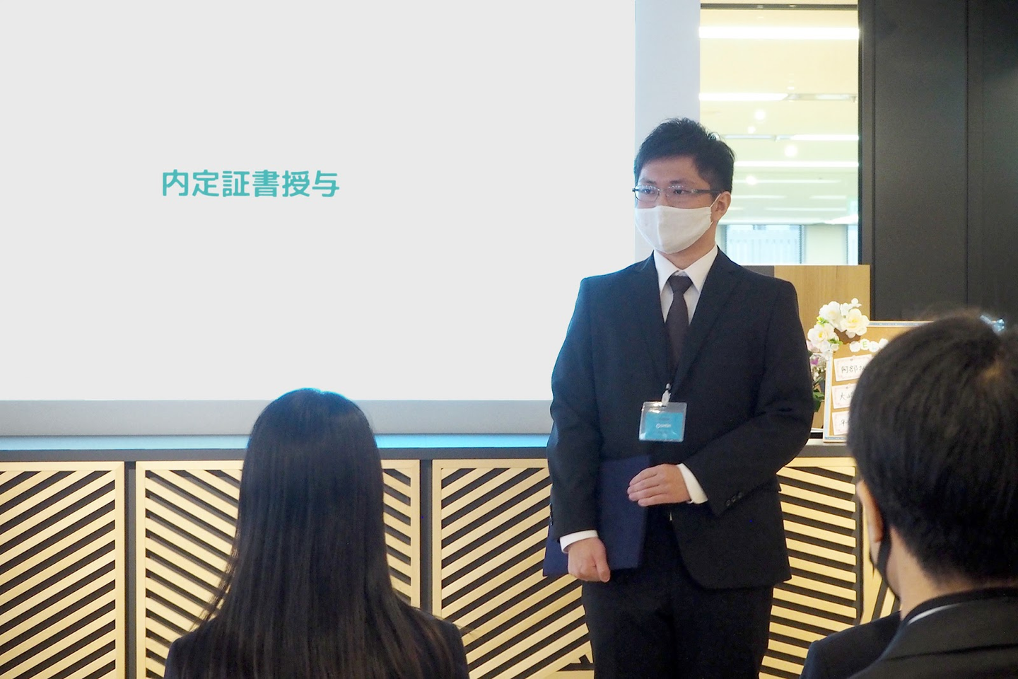 続いて、内定証書の授与。「あなたは当社ミッション実現のための大切な仲間です」というメッセージと共に、ひとりひとりに内定証書が手渡され、内定者がそれぞれ意気込みを表明!