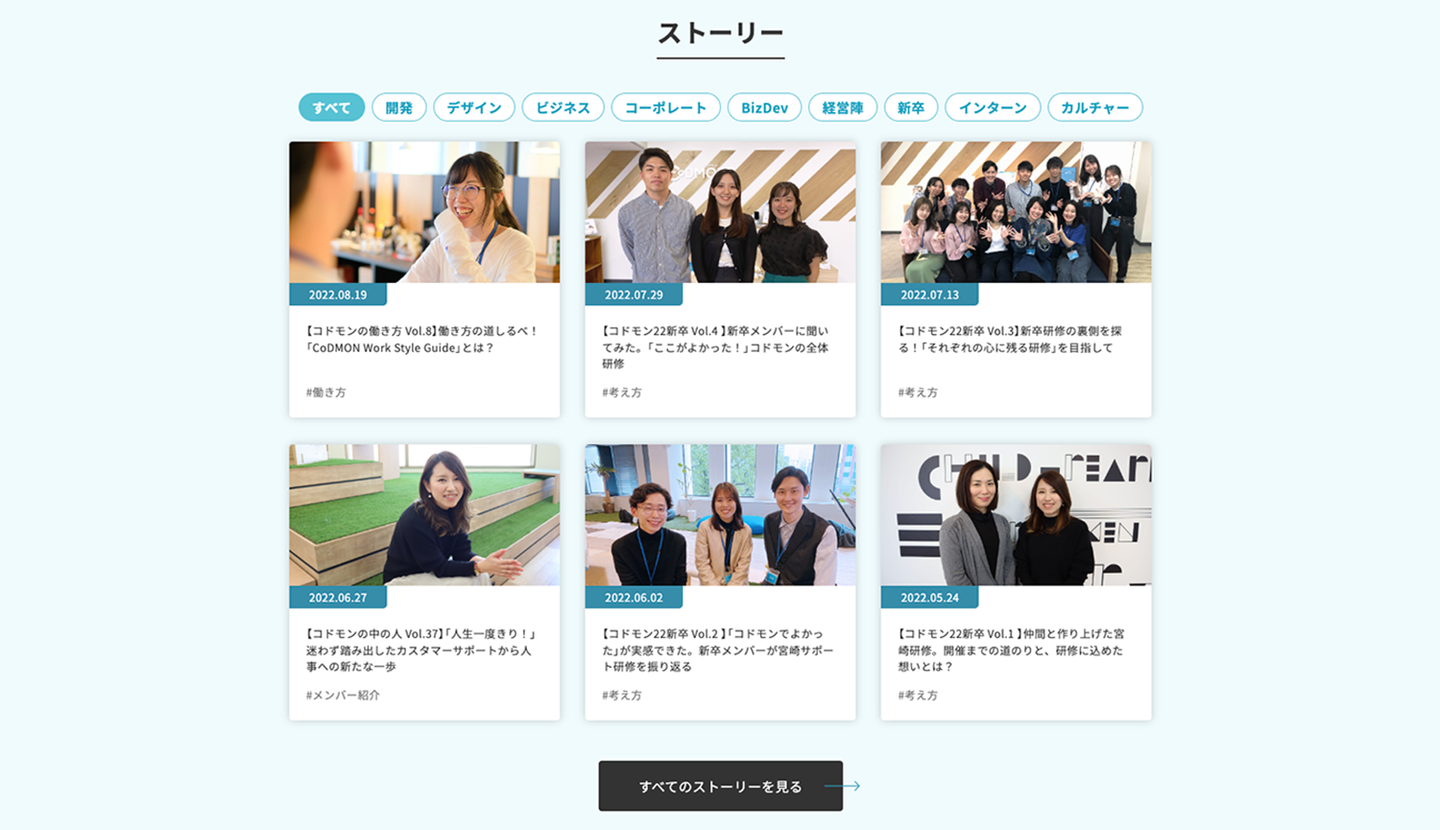 会社案内をブラウザ上で見ることができるようにしたり、ブログや記事にリンクを設けたことにより、このページをひととおり見ていただければ、コドモンの理解が深まるよう、コンテンツの整理を行っています。また、ストーリーの絞り込みを可能にしたり、求人情報を職種別で検索できるようにするなど(9月上旬に実装予定)、求職者にとって欲しい情報に早く辿り着けるように設計しました。