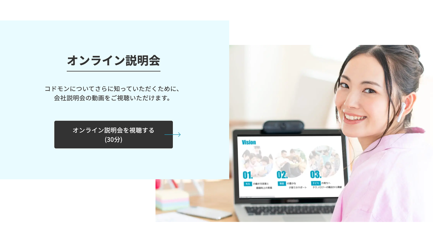 (マーケデザイナー:安彦) コドモンがどういう会社なのか、会社として取り組む課題をメッセージとして強く打ち出すことで、ミッションやビジョンに賛同いただける方への訴求をより高めました。