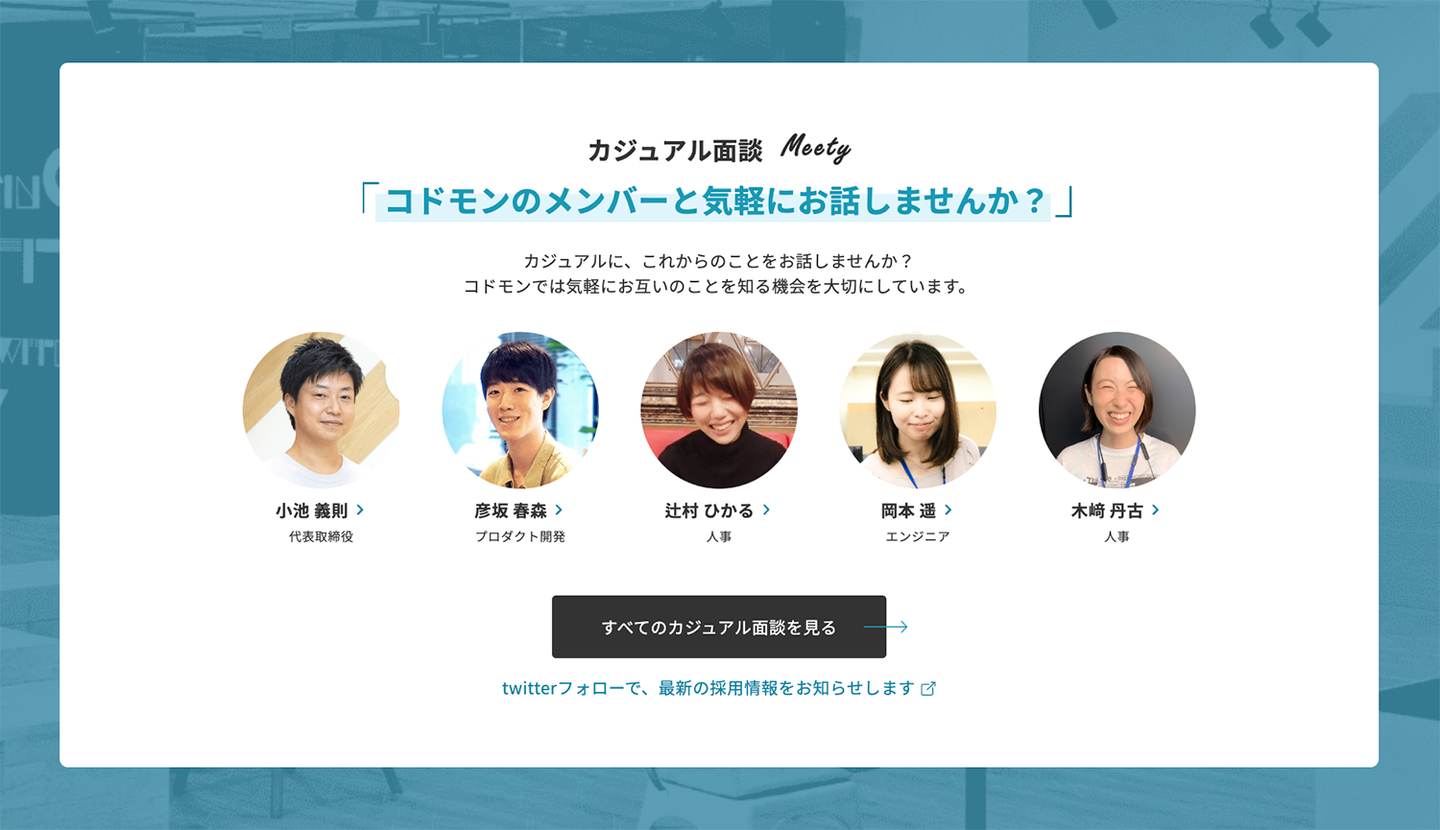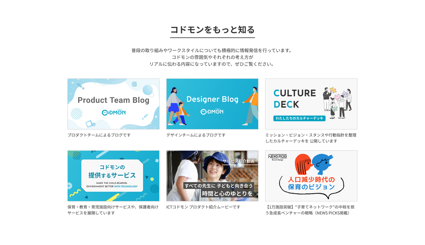 コドモンではMeetyでのカジュアル面談も積極的に取り組んでおり、リクルートページからも様々な部署のメンバーとの面談にご応募いただけるようになりました。 今まではエントリーのみでしたが、気軽にみなさまとお話する機会ができたので、気になるメンバーがいれば是非チェックしてみてください!