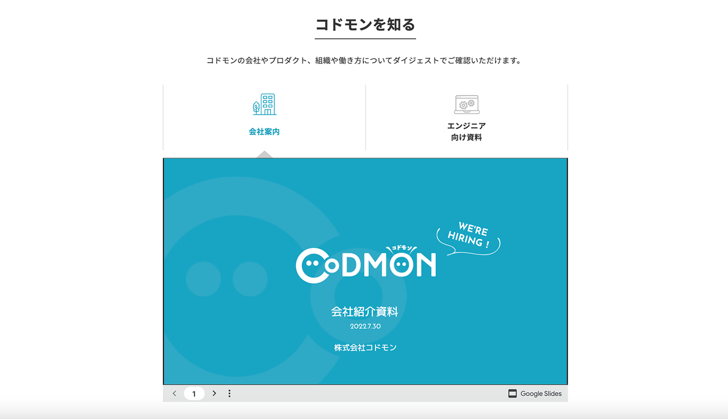 (代表:小池) 自社の採用ページは関心を持っていただいた方が、コドモンの事業やチームについて理解を深めるために情報提供をする場だと思っています。今回のリニューアルでは、様々な場所に散らかっていた、「応募者として知っておいてほしいこと」「応募者が知りたいと思うこと」を整理することに注力しました。ピッチ資料も、今の会社に合わせて1から作り直しをしています。