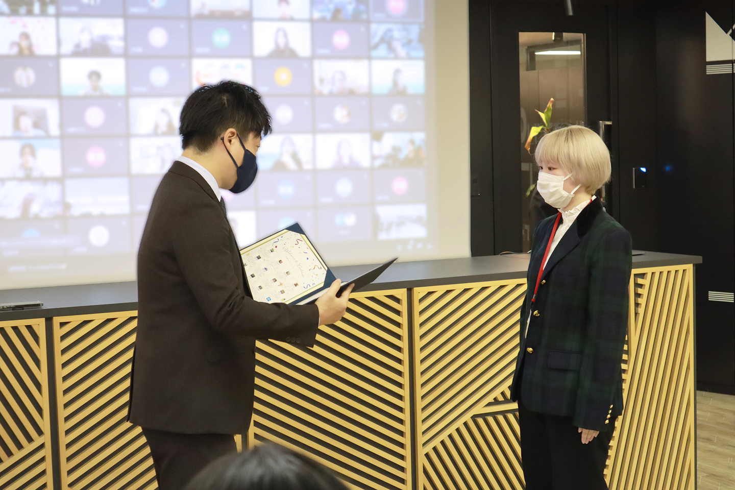 授与の後には取締役および執行役員と、先輩社員代表として新卒2期生の若林さんからメッセージが贈られました。