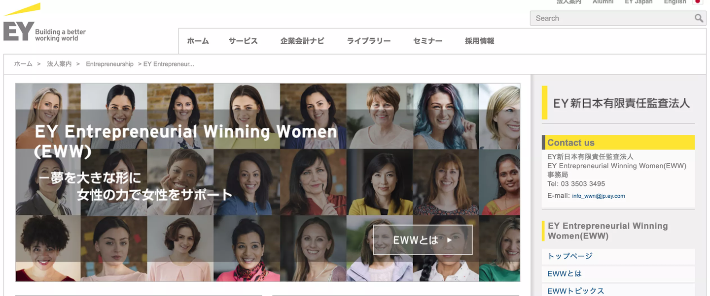 EY Entrepreneurial Winning Women(EWW)とは、女性経営者と女性エグゼクティブを公認会計士、税理士、金融機関関係者(証券会社、ベンチャーキャピタル等)、弁護士などの専門家が主に経営管理の側面からサポートし、ビジネスに関する情報やネットワーキングの場を提供する組織です。米国で2008年に開始され、これまでに約50カ国から、さまざまな業界で会社を経営している女性アントレプレナーが430名以上参加しています。アワードの実施や企業経営に必要な情報提供や人脈づくりのためのセミナーや交流会の開催なども行っています。