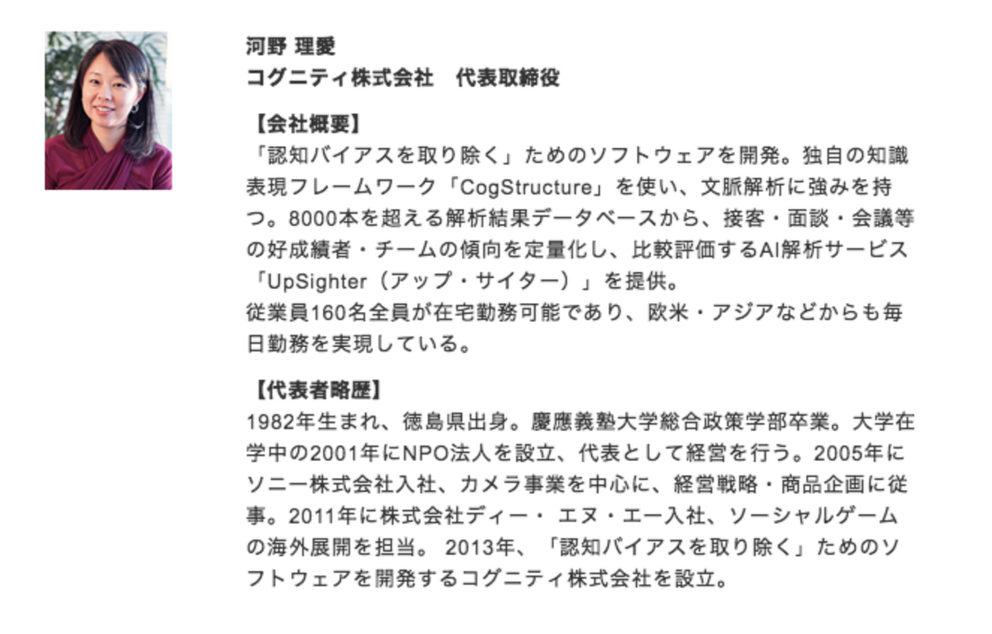 (コグニティ株式会社代表取締役 河野理愛プロフィール)