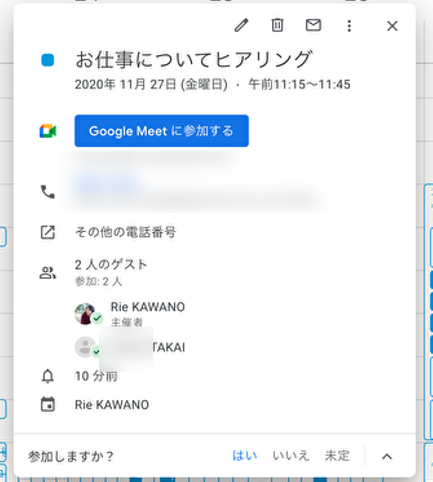 MTGをしたい時は、Googleのカレンダー機能を使って、誘いたい相手のスケジュールをチェック。