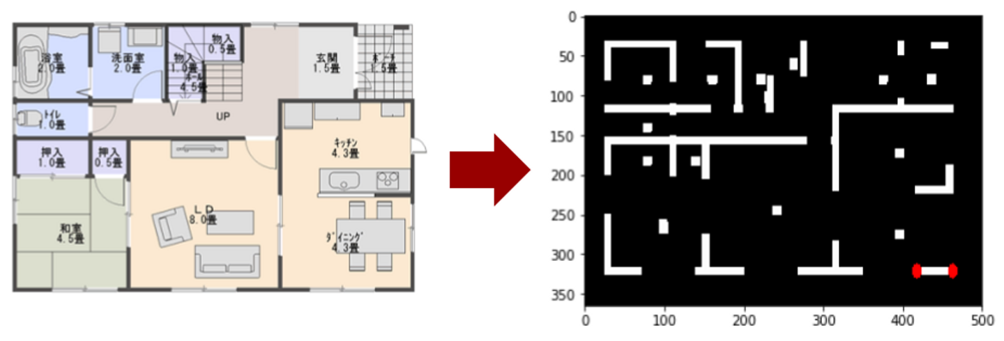 図面上の壁の情報は、複数の線分という形で表現されています。画像内から線分を抽出するのはOpenCVなどの一般的なライブラリを使って行うことができます。ただしそれだけだと不十分です。我々が想定している図面は様々なパターンがあるため、線分の太さ、結合部の書き方、線分の隙間の意味など色々なパターンが考えられます。ここでは一般的なライブラリを使いながら様々な図面のルールに対応するための工夫を機能的に開発して、できる限り自動的に壁検出を行っていきます。