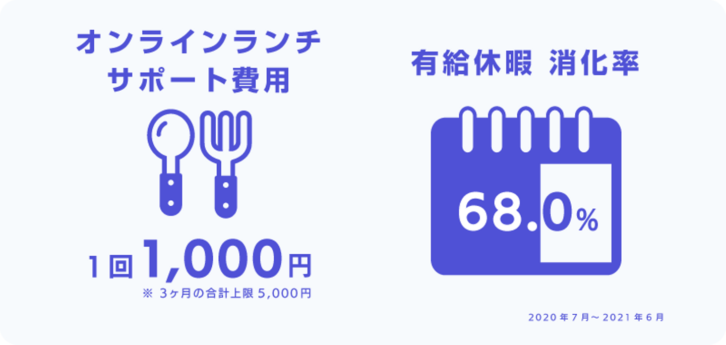 新型コロナウイルスの感染拡大を抑えるために在宅勤務をしている従業員に対し、水道光熱費や通信費の補助として月額10,000円を支給しています。また、コロナ禍における住環境整備の支援として、出社/在宅に関わらず、従業員(正社員、アソシエイト社員、契約社員、常勤アルバイト)に「どこでも住宅手当」月額10,000円を支給しています(※ 「どこでも住宅手当」は2021年2月〜2023年1月末までの期間限定です)。