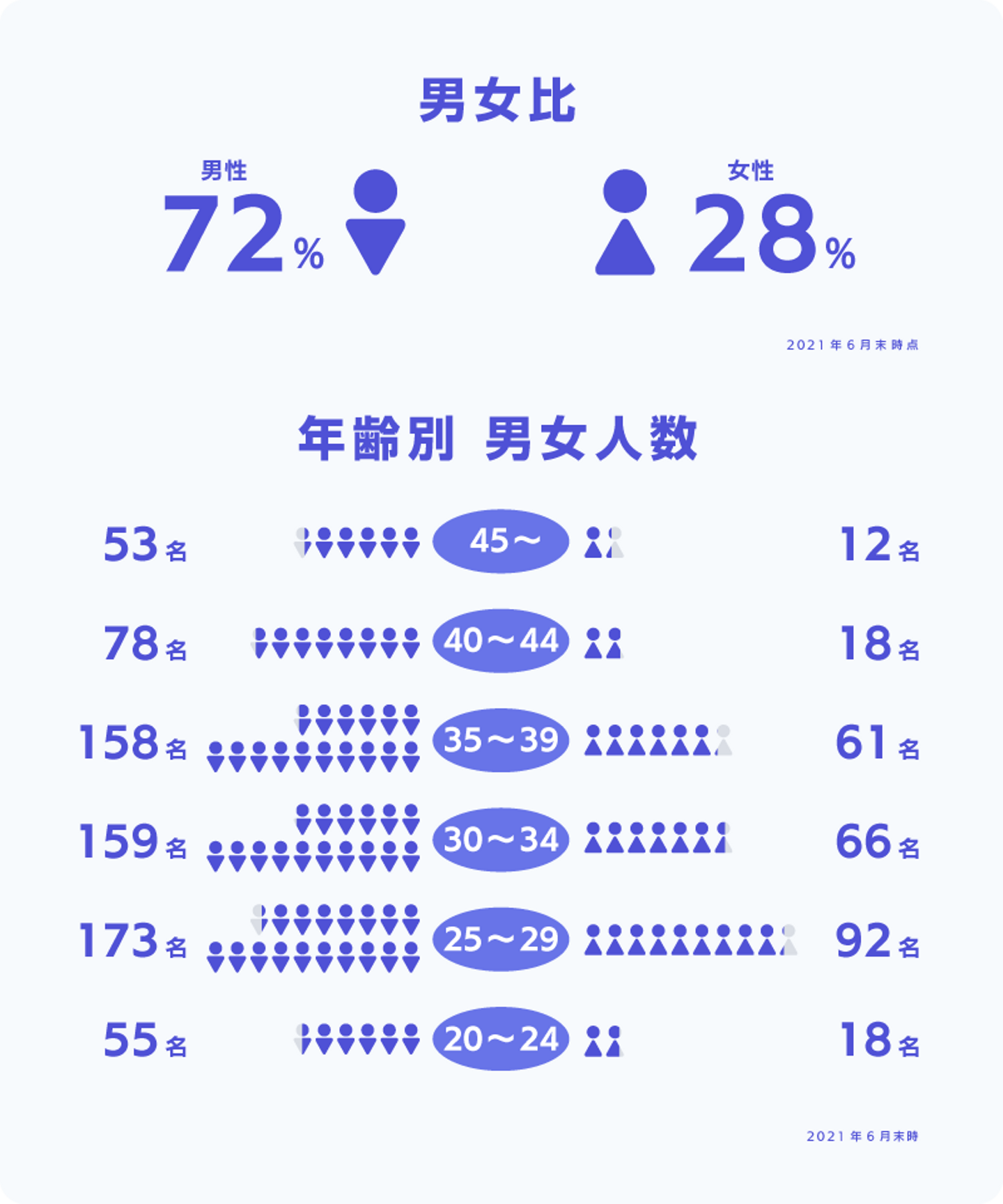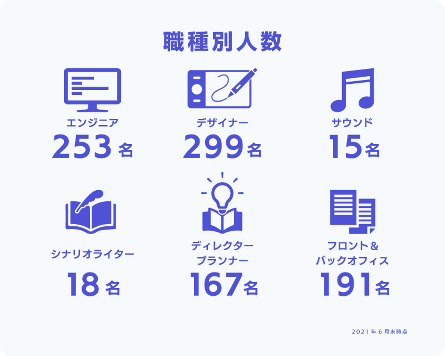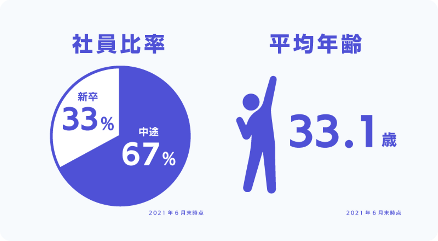 2008年に設立したコロプラは、2012年に新卒社員を初めて採用して以来、毎年新卒社員の採用を実施してきました。943名の全社員のうち309名が新卒社員で(2021年6月末時点)、全体の約3割を占めています。また、全社員の平均年齢は「33.1歳」です。