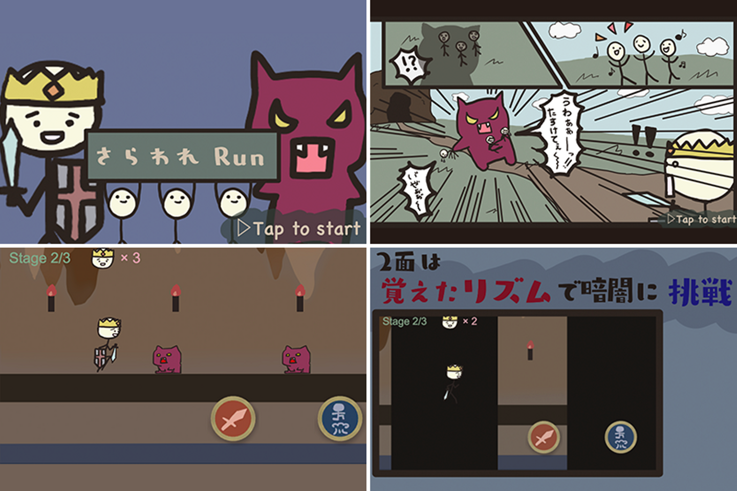 『さらわれ Run』というタイトル通り、村の子供達が遊んでいると謎のモンスターに、アジトである洞窟へさらわれ、それを村の勇者が助けに行くというカジュアルゲームです。このゲームのコンセプトは「思いがけず指が覚えた記憶を頼りに、リズムに乗ってダンジョンを突破、子供達を助ける横スクロールRunアクションゲーム」というものです。リズムに合わせて穴を避けたり、モンスターを倒したりして、暗闇のなかでも同じリズムと同じタイミングでそれらを体験します。