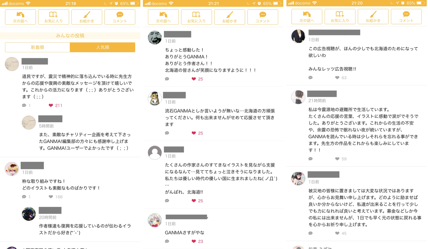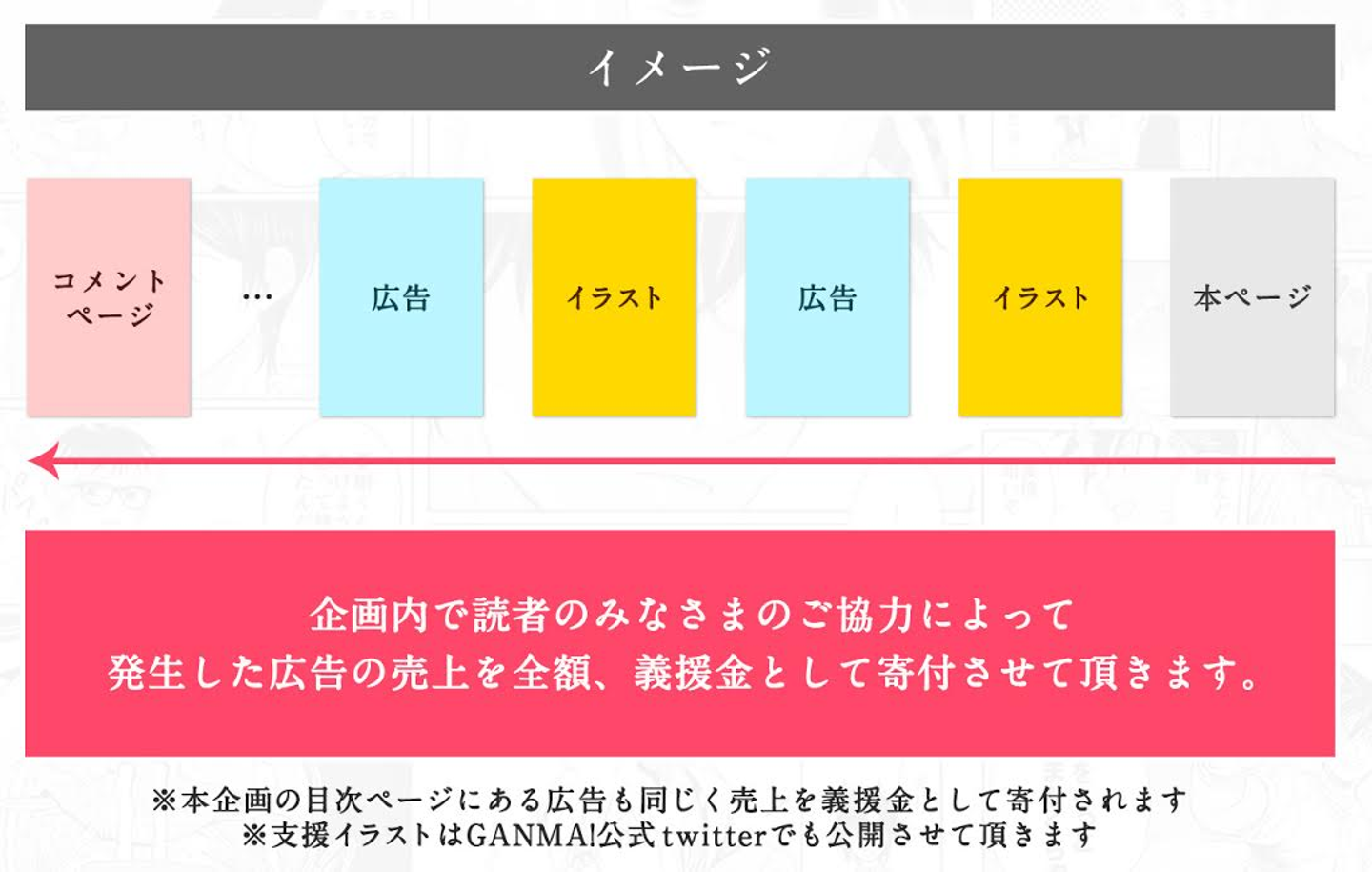 今回の企画は、GANMA!の広告モデルがベースとなっています。GANMA!では無料でマンガ作品が読め、読者がその間にある広告を見ることで収益を得ています。今回の企画も、このモデルを活用して、作家さんに書いていただいた被災地の方への応援イラストをGANMA!内で掲載し、そのイラストひとつひとつの間に広告を設置し、得られた広告収益を義援金として寄付する、といった仕組みとなっています。