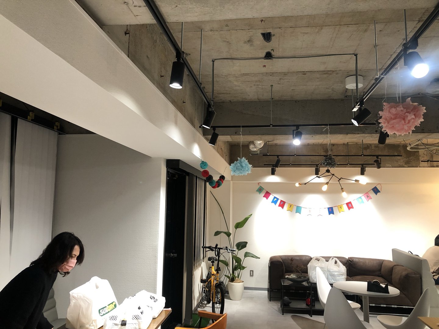 パーティ当日夕方ごろから東京メンバーでオフィスのカフェスペースを飾り付け、飲み物・食べ物を準備