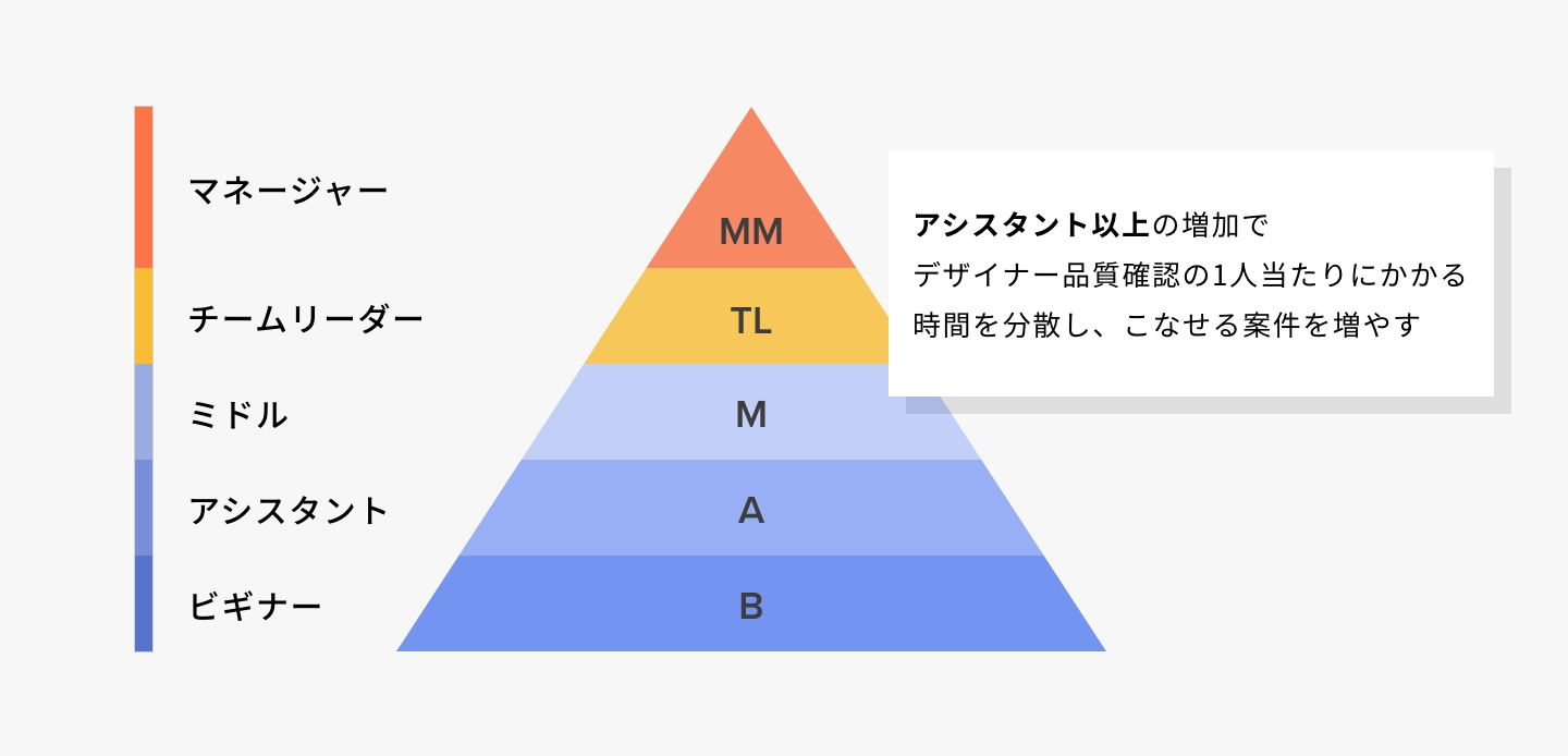 ですが、現在はマネージャー・リーダーに比べ、アシスタントの所属が多い体制になってしまっており、デザイン品質確認への負担が大きくなっている状態です。