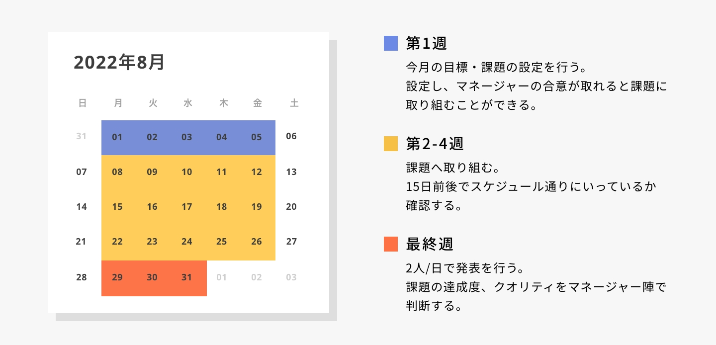そして発表後はマネージャー陣から「課題の達成度」「クオリティ」「プレゼン能力」などを5段階で評価したシートが送られてくるので、次の月に改善していくという流れになります。